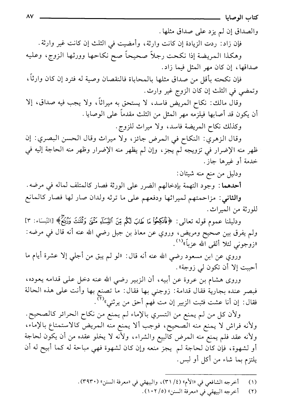 ولأن كل من لم يمنع من التسري بالإماء لم يمنع من نكاح الحرائر كالصحيح. ولأنه فراش لا يمنع منه الصحيح، فوجب ألا يمنع منه المريض كالاستمتاع بالإماء، ولأن عقد فلم يمنع منه المرض كالبيع والشراء، ولأنه لا يخلو عقده من أن يكون لحاجة أو لشهوة، فإن كان لحاجة لم يجز منعه وإن كان لشهوة فهي مباحة له كما أبيح له أن يلتزم بما شاء من أكل أو لبس.