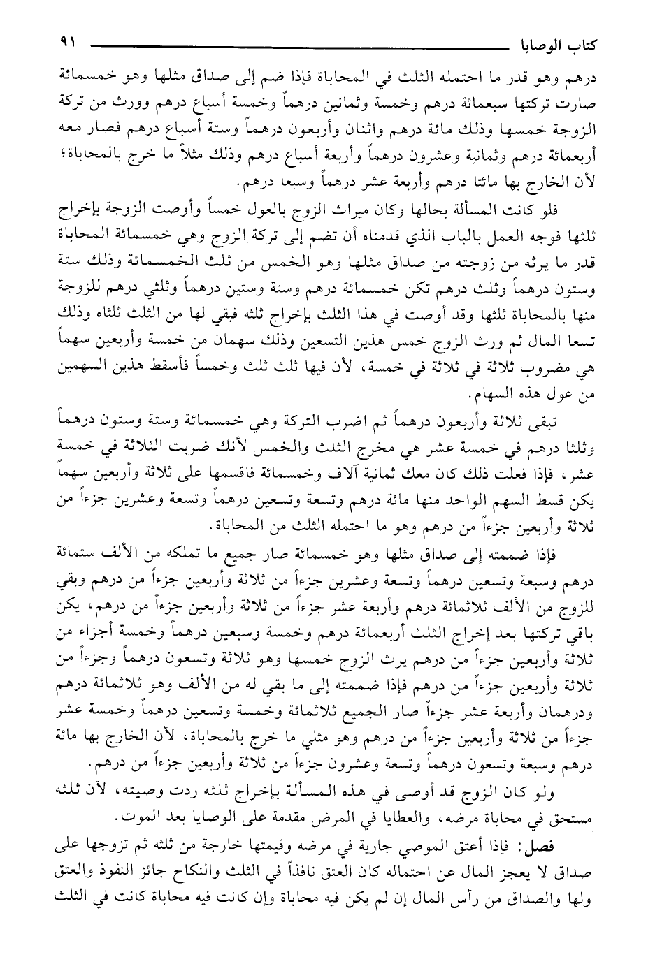 فإذا ضممته إلى صداق مثلها وهو خمسمائة صار جميع ما تملكه من الألف ستمائة درهم وسبعة وتسعين درهمًا وتسعة وعشرين جزءًا من ثلاثة وأربعين جزءً من درهم وبقي للزوج من الألف ثلاثمائة درهم وأربعة عشر جزءًا من ثلاثة وأربعين جزءًا من درهم، يكن باقي تركتها بعد إخراج الثلث أربعمائة درهم وخمسة وسبعين درهمًا وخمسة أجزاء من ثلاثة وأربعين جزءًا من درهم يرث الزوج خمسها وهو ثلاثة وتسعون درهمًا وجزءًا من ثلاثة وأربعين جزءًا من درهم فإذا ضممته إلى ما بقي له من الألف وهو ثلاثمائة درهم ودرهمان وأربعة عشر جزءًا صار الجميع ثلاثمائة وخمسة وتسعين درهمًا وخمسة عشر جزءًا من ثلاثة وأربعين جزءًا من درهم وهو مثلي ما خرج بالمحاباة، لأن الخارج بها مائة درهم وسبعة وتسعون درهمًا وتسعة وعشرون جزءًا من ثلاثة وأربعين جزءًا من درهم.