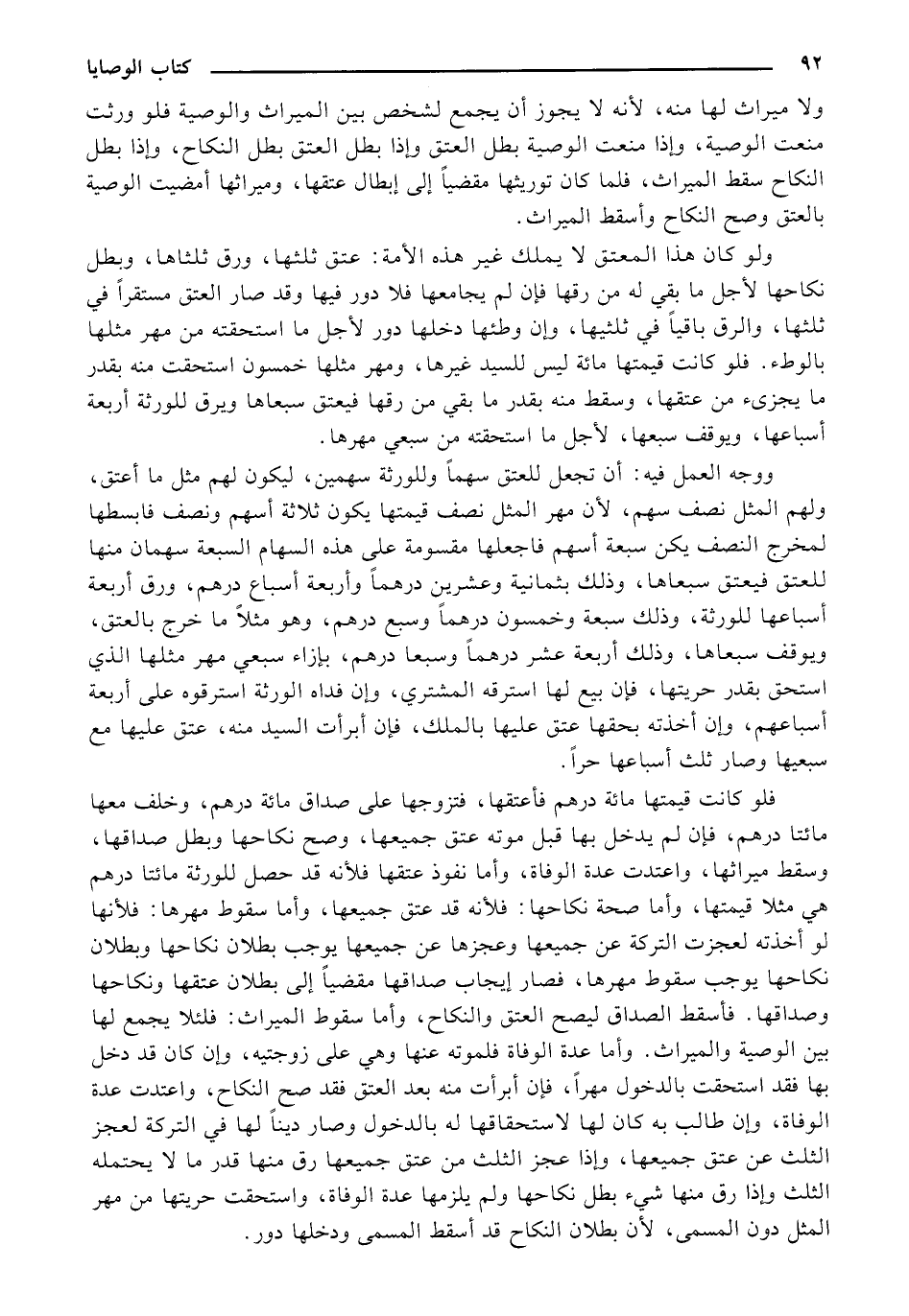 ووجه العمل فيه: أن تجعل للعتق سهمًا وللورثة سهمين، ليكون لهم مثل ما أعتق، ولهم المثل نصف سهم، لأن مهر المثل نصف قيمتها يكون ثلاثة أسهم ونصف فابسطها لمخرج النصف يكن سبعة أسهم فاجعلها مقسومة على هذه السهام السبعة سهمان منها للعتق فيعتق سبعاها، وذلك بثمانية وعشرين درهمًا وأربعة أسباع درهم، ورق أربعة أسباعها للورثة، وذلك سبعة وخمسون درهمًا وسبع درهم، وهو مثلًا ما خرج بالعتق، ويوقف سبعاها، وذلك أربعة عشر درهمًا وسبعا درهم، بإزاء سبعي مهر مثلها الذي استحق بقدر حريتها، فإن بيع لها استرقه المشتري، وإن فداه الورثة استرقوه على أربعة أسباعهم، وإن أخذته بحقها عتق عليها بالملك، فإن أبرأت السيد منه، عتق عليها مع سبعيها وصار ثلث أسباعها حرًا.