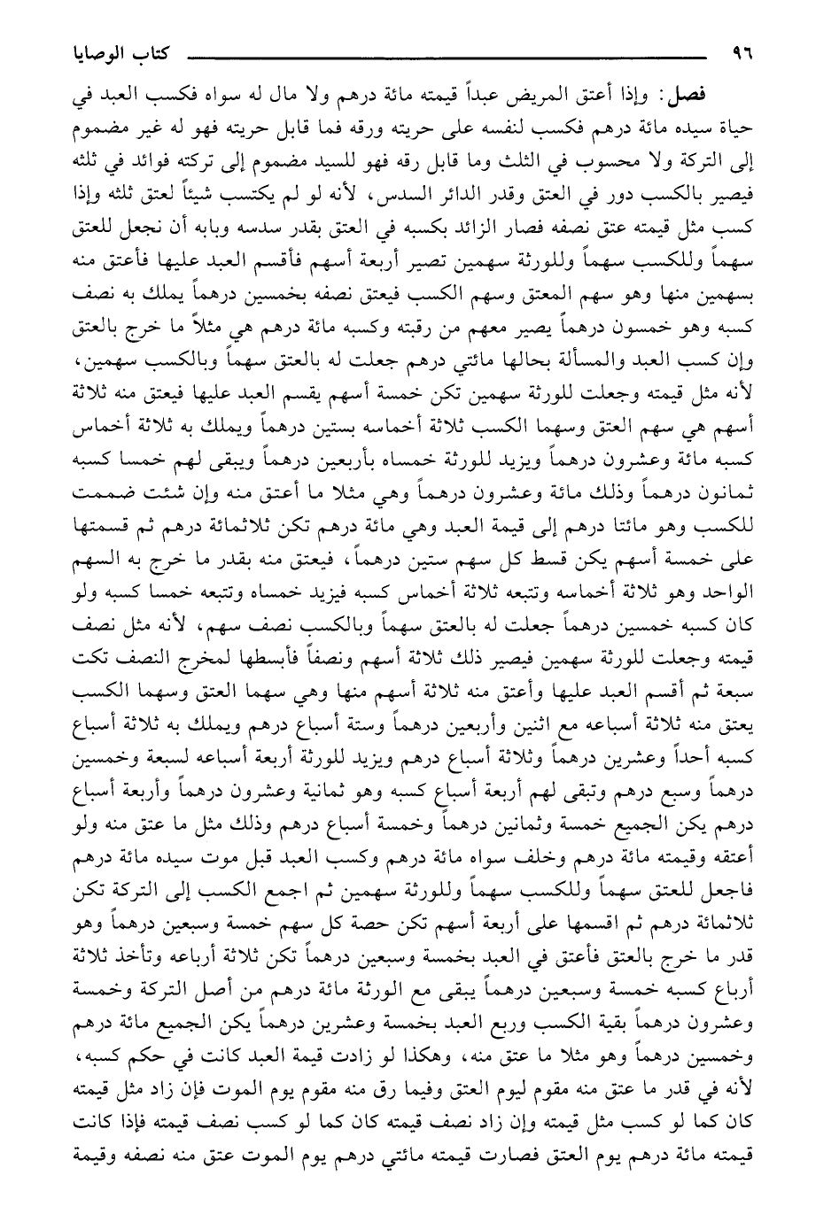 فصل: وإذا أعتق المريض عبدًا قيمته مائة درهم ولا مال له سواه فكسب العبد في حياة سيده مائة درهم فكسب لنفسه على حريته ورقه فما قابل حريته فهو له غير مضموم إلى التركة ولا محسوب في الثلث وما قابل رقه فهو للسيد مضموم إلى تركته فوائد في ثلثه فيصير بالكسب دور في العتق وقدر الدائر السدس، لأنه لو لم يكتسب شيئًا لعتق ثلثه وإذا كسب مثل قيمته عتق نصف فصار الزائد بكسبه في العتق بقدر سدسه وبابه أن نجعل للعتق سهمًا وللكسب سهمًا وللورثة سهمين تصير أربعة أسهم فأقسم العبد عليها فأعتق منه بسهمين منها وهو سهم المعتق وسهم الكسب فيعتق نصفه بخمسين درهمًا يملك به نصف كسبه وهو خمسون درهمًا يصير معهم من رقبته وكسبه مائة درهم هي مثلًا ما خرج بالعتق وإن كسب العبد والمسألة بحالها مائتي درهم جعلت له بالعتق سهمًا وبالكسب سهمين، لأنه مثل قيمته وجعلت للورثة سهمين تكن خمسة أسهم يقسم العبد عليها فيعتق منه ثلاثة أسهم هي سهم العتق وسهما الكسب ثلاثة أخماسه بستين درهمًا ويملك به ثلاثة أخماس كسبه مائة وعشرون درهمًا ويزيد للورثة خمساه بأربعين درهمًا ويبقي لهم خمسا كسبه ثمانون درهمًا وذلك مائة وعشرون درهمًا وهي مثلًا ما أعتق منه وإن شئت ضممت للسب وهو مائتا درهم إلى قيمة العبد وهي مائة درهم تكن ثلاثمائة درهم ثم قسمتها على خمسة أسهم يكن قسط كل سهم ستين درهمًا، فيعتق منه بقدر ما خرج به السهم الواحد وهو ثلاثة أخماسه وتتبعه ثلاثة أخماس كسبه فيزيد خمساه وتتبعه خمسا كسبه ولو كان كسبه خمسين درهمًا جعلت له بالعتق سهمًا وبالكسب نصف سهم، لأنه مثل نصف قيمته وجعلت للورثة سهمين فيصير ذلك ثلاثة أسهم ونصفًا فأبسطها لمخرج النصف تكت سبعة ثم أقسم العبد عليها وأعتق منه ثلاثة أسهم منها وهي سهما العتق وسهما الكسب يعتق منه ثلاثة أسباعه مع اثنين وأربعين درهمًا وستة أسباع درهم ويملك به ثلاثة أسباع كسبه أحدًا وعشرين درهمًا وثلاثة أسباع درهم ويزيد للورثة أربعة أسباعه لسبعة وخمسين درهمًا وسبع درهم وتبقي لهم أربعة أسباع كسبه وهو ثمانية وعشرون درهمًا وأربعة أسباع درهم يكن الجميع خمسة وثمانين درهمًا وخمسة أسباع درهم وذلك مثل ما عتق منه ولو أعتقه وقيمته مائة درهم وخلف سواه مائة درهم وكسب العبد قبل موت سيده مائة درهم فاجعل للعتق سهمًا وللكسب سهمًا وللورثة سهمين ثم اجمع الكسب إلى التركة تكن ثلاثمائة درهم ثم أقسمها على أربعة أسهم تكن حصة كل سهم خمسة وسبعين درهمًا وهو قدر ما خرج بالعتق فأعتق في العبد بخمسة وسبعين درهمًا تكن ثلاثة أرباعه وتأخذ ثلاثة أرباع كسبه خمسة وسبعين درهمًا يبقي مع الورثة مائة درهم من أصل التركة وخمسة وعشرون درهمًا بقية الكسب وربع العبد بخمسة وعشرين درهمًا يكن الجميع مائة درهم وخمسين درهمًا وهو مثلًا ما عتق منه، وهكذا لو زادت قيمة العبد كانت في حكم كسبه، لأنه في قدر ما عتق منه مقوم ليوم العتق وفيما رق منه مقوم يوم الموت فإن زاد مثل قيمته كان كما لو كسب مثل قيمته وإن زاد نصف قيمته كان كما لو كسب نصف قيمته فإذا كانت قيمته مائة درهم يوم العتق فصارت قيمته مائتي درهم يوم الموت عتق منه نصفه (وقيمة)