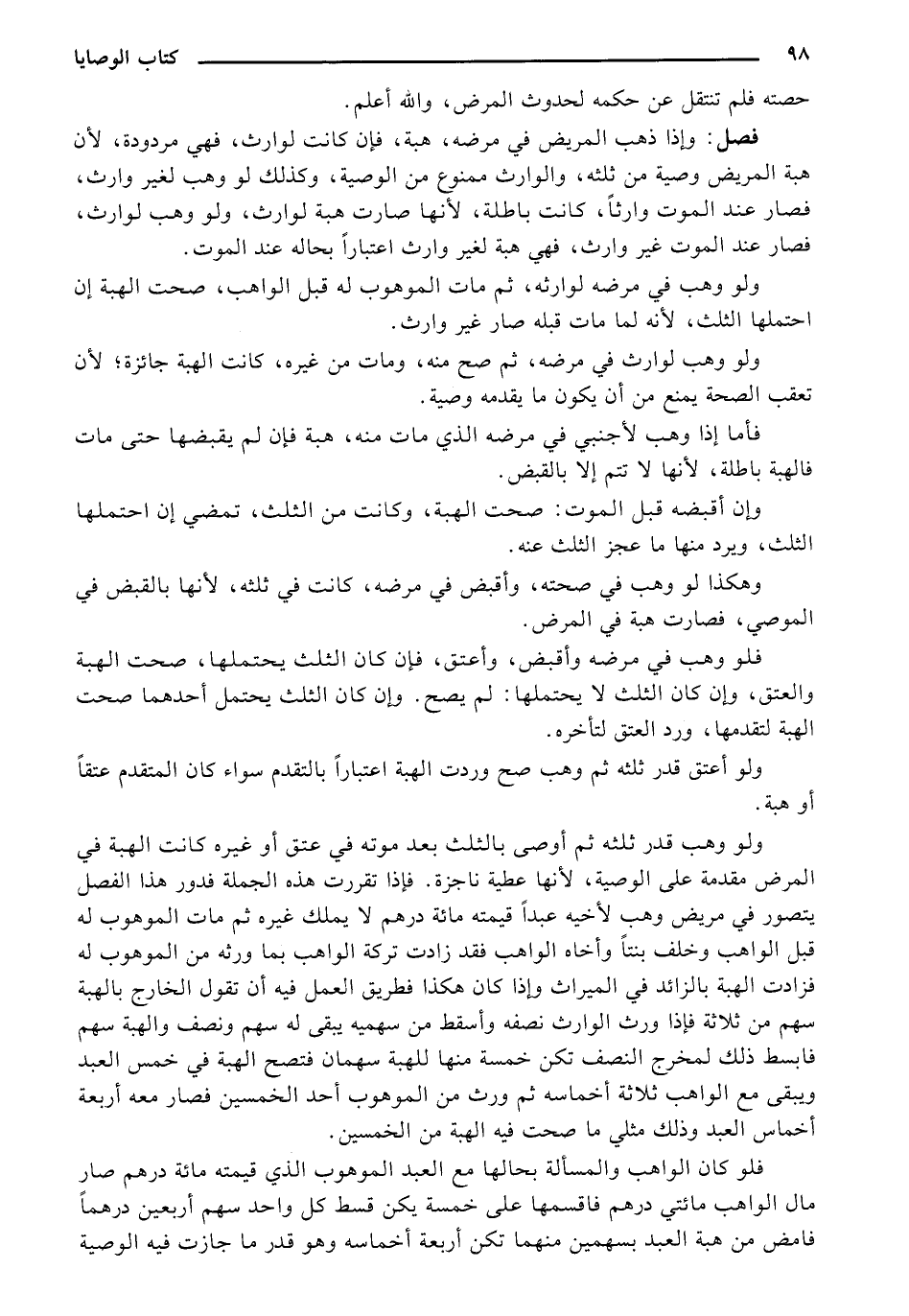 ولو وهب قدر ثلثه ثم أوصي بالثلث بعد موته في عتق أو غيره كانت الهبة في المرض مقدمة على الوصية، لنها عطية ناجزة. فإذا تقررت هذه الجملة فدور هذا الفصل يتصور في مريض وهب لأخيه عبدًا قيمته مائة درهم لا يملك غيره ثم مات الموهوب له قبل الواهب وخلف بنتًا وأخاه الواهب فقد زادت تركة الواهب بما ورثه من الموهوب له فزادت الهبة بالزائد في الميراث وإذا كان هكذا فطريق العمل فيه أن تقول الخارج بالهبة سهم من ثلاثة فإذا ورث الوارث نصفه وأسقط من سهميه يبقي له سهم ونصف والهبة سهم فابسط ذلك لمخرج النصف تكن خمسة منها للهبة سهمان فتصح الهبة في خمس العبد ويبقي مع الواهب ثلاثة أخماسه ثم ورث من الموهوب أحد الخمسين فصار معه أربعة أخماس العبد وذلك مثلي ما صحت فيه الهبة من الخمسين.