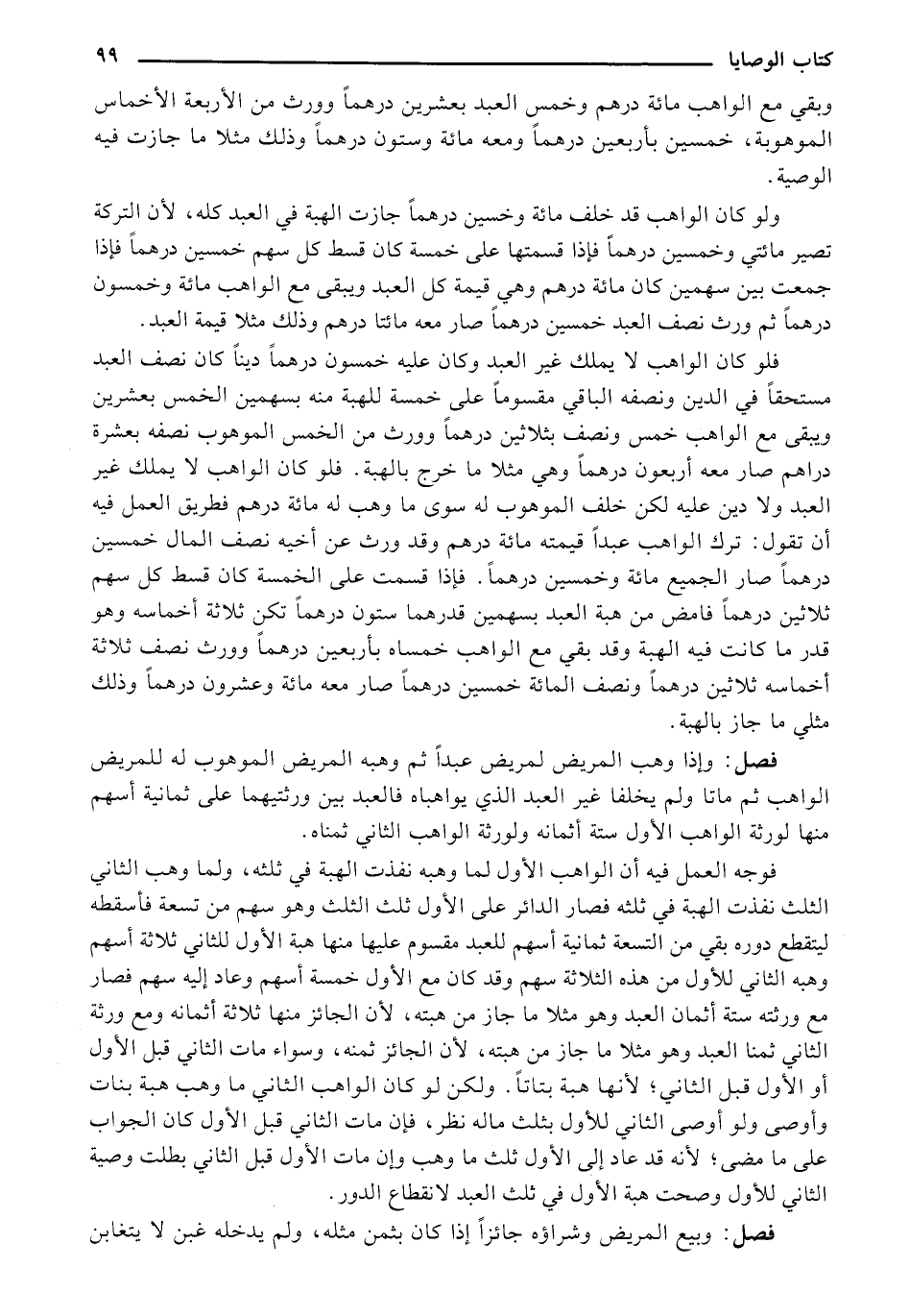 فوجه العمل فيه أن الواهب الأول لما وهبه نفذه الهبة في ثلثه، ولما وهب الثاني الثلث نفذت الهبة في ثلثه فصار الدائر على الأول ثلث الثلث وهو سهم من تسعة فأسقطه ليتقطع دوره بقي من التسعة ثمانية أسهم للعبد مقسوم عليها منها هبة الأول للثاني ثلاثة أسهم وهبة الثاني للأول من هذه الثلاثة سهم وقد كان مع الأول خمسة أسهم وعاد إليه سهم فصار مع ورثته ستة أثمان العبد وهو مثلًا ما جاز من هبته، لن الجائز منها ثلاثة أثمانه ومع ورثة الثاني ثمنا العبد وهو مثلًا ما جاز من هبته، لأن الجائز ثمنه، وسواء مات الثاني قبل الأول أو الأول قبل الثاني؛ لأنها هبة بتاتًا. ولكن لو كان الواهب الثاني ما وهب هبة بنات وأوصي ولو أوصي الثاني للأول بثلث ماله نظر، فإن مات الثاني قبل الأول كان الجواب على ما مضي؛ لأنه قد عاد إلى الأول ثلث ما وهب وإن مات الأول قبل الثاني بطلت وصية الثاني للأول وصحت هبة الأول في ثلث العبد لانقطاع الدور.