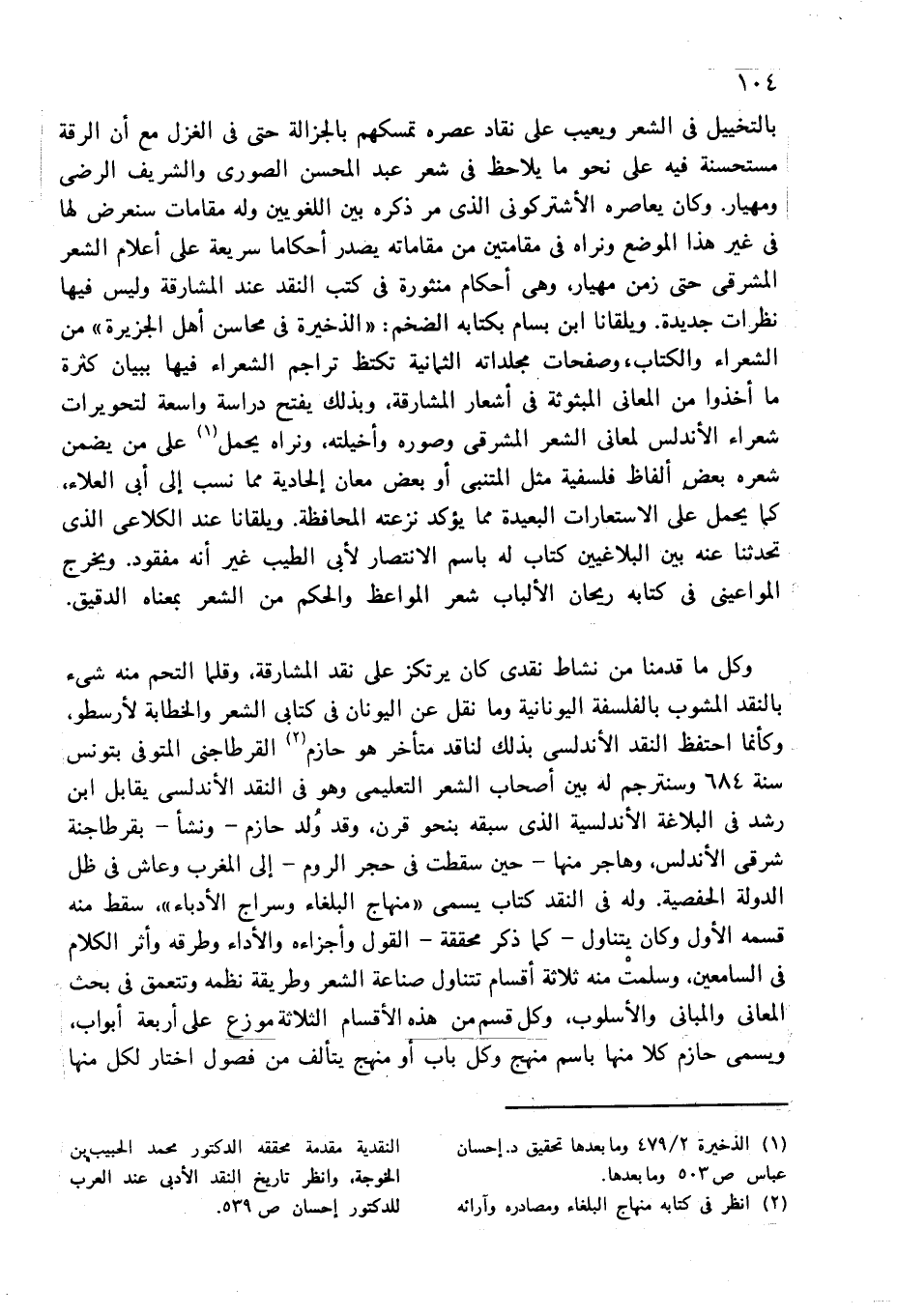 (¬2) انظر فى كتابه منهاج البلغاء ومصادره وآرائه النقدية مقدمة محققه الدكتور محمد الحبيب بن الخوجة، وانظر تاريخ النقد الأدبى عند العرب للدكتور إحسان ص 539.
