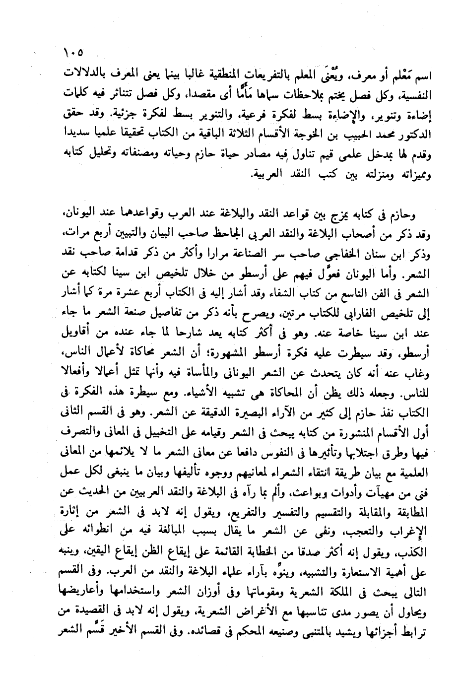 وحازم فى كتابه يمزج بين قواعد النقد والبلاغة عند العرب وقواعدهما عند اليونان، وقد ذكر من أصحاب البلاغة والنقد العربى الجاحظ صاحب البيان والتبيين أربع مرات، وذكر ابن سنان الخفاجى صاحب سر الصناعة مرارا وأكثر من ذكر قدامة صاحب نقد الشعر. وأما اليونان فعوّل فيهم على أرسطو من خلال تلخيص ابن سينا لكتابه عن الشعر فى الفن التاسع من كتاب الشفاء وقد أشار إليه فى الكتاب أربع عشرة مرة كما أشار إلى تلخيص الفارابى للكتاب مرتين، ويصرح بأنه ذكر من تفاصيل صنعة الشعر ما جاء عند ابن سينا خاصة عنه. وهو فى أكثر كتابه يعد شارحا لما جاء عنده من أقاويل أرسطو، وقد سيطرت عليه فكرة أرسطو المشهورة؛ أن الشعر محاكاة لأعمال الناس، وغاب عنه أنه كان يتحدث عن الشعر اليونانى والمأساة فيه وأنها تمثل أعمالا وأفعالا للناس. وجعله ذلك يظن أن المحاكاة هى تشبيه الأشياء. ومع سيطرة هذه الفكرة فى الكتاب نفذ حازم إلى كثير من الآراء البصيرة الدقيقة عن الشعر. وهو فى القسم الثانى أول الأقسام المنشورة من كتابه يبحث فى الشعر وقيامه على التخييل فى المعانى والتصرف فيها وطرق اجتلابها وتأثيرها فى النفوس دافعا عن معانى الشعر ما لا يلائمها من المعانى العلمية مع بيان طريقة انتقاء الشعراء لمعانيهم ووجوه تأليفها وبيان ما ينبغى لكل عمل فنى من مهيآت وأدوات وبواعث، وألم بما رآه فى البلاغة والنقد العربيين من الحديث عن المطابقة والمقابلة والتقسيم والتفسير والتفريع، ويقول إنه لا بد فى الشعر من إثارة الإغراب والتعجب، ونفى عن الشعر ما يقال بسبب المبالغة فيه من انطوائه على الكذب، ويقول إنه أكثر صدقا من الخطابة القائمة على إيقاع الظن إيقاع اليقين، وينبه على أهمية الاستعارة والتشبيه، وينوّه بآراء علماء البلاغة والنقد من العرب. وفى القسم التالى يبحث فى الملكة الشعرية ومقوماتها وفى أوزان الشعر واستخدامها وأعاريضها ويحاول أن يصور مدى تناسبها مع الأغراض الشعرية، ويقول إنه لا بد فى القصيدة من ترابط أجزائها ويشيد بالمتنبى وصنيعه المحكم فى قصائده. وفى القسم الأخير قسّم الشعر