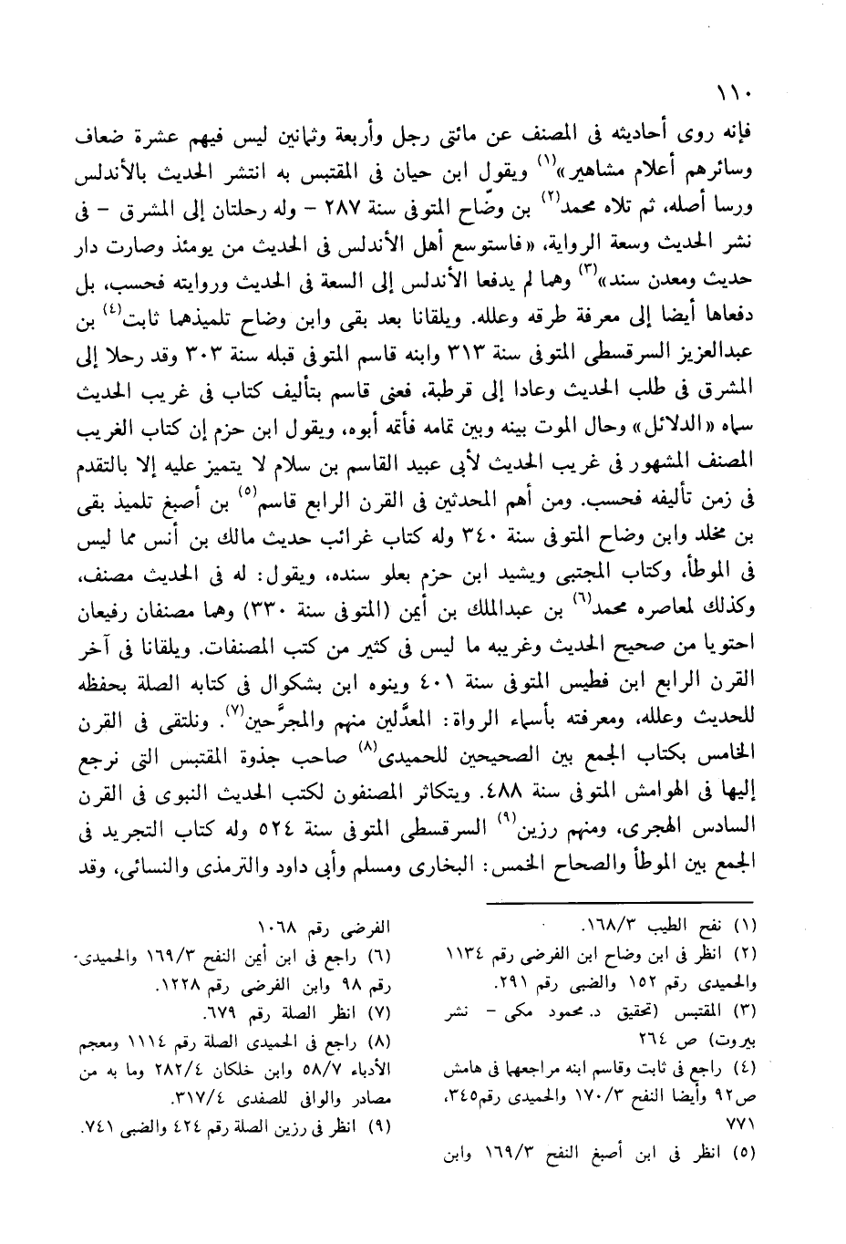 فإنه روى أحاديثه فى المصنف عن مائتى رجل وأربعة وثمانين ليس فيهم عشرة ضعاف وسائرهم أعلام مشاهير» (¬1) ويقول ابن حيان فى المقتبس به انتشر الحديث بالأندلس ورسا أصله، ثم تلاه محمد (¬2) بن وضّاح المتوفى سنة 287 - وله رحلتان إلى المشرق-فى نشر الحديث وسعة الرواية، «فاستوسع أهل الأندلس فى الحديث من يومئذ وصارت دار حديث ومعدن؟ ؟ ؟ سنة» (¬3) وهما لم يدفعا الأندلس إلى السعة فى الحديث وروايته فحسب، بل دفعاها أيضا إلى معرفة طرقه وعلله. ويلقانا بعد بقى وابن وضاح تلميذهما ثابت (¬4) بن عبد العزيز السرقسطى المتوفى سنة 313 وابنه قاسم المتوفى قبله سنة 303 وقد رحلا إلى المشرق فى طلب الحديث وعادا إلى قرطبة، فعنى قاسم بتأليف كتاب فى غريب الحديث سماه «الدلائل» وحال الموت بينه وبين تمامه فأتمه أبوه، ويقول ابن حزم إن كتاب الغريب المصنف المشهور فى غريب الحديث لأبى عبيد القاسم بن سلام لا يتميز عليه إلا بالتقدم فى زمن تأليفه فحسب. ومن أهم المحدثين فى القرن الرابع قاسم (¬5) بن أصبغ تلميذ بقى بن مخلد وابن وضاح المتوفى سنة 340 وله كتاب غرائب حديث مالك بن أنس مما ليس فى الموطأ، وكتاب المجتبى ويشيد ابن حزم بعلو سنده، ويقول: له فى الحديث مصنف، وكذلك لمعاصره محمد (¬6) بن عبد الملك بن أيمن (المتوفى سنة 330) وهما مصنفان رفيعان احتويا من صحيح الحديث وغريبه ما ليس فى كثير من كتب المصنفات. ويلقانا فى آخر القرن الرابع ابن فطيس المتوفى سنة 401 وينوه ابن بشكوال فى كتابه الصلة بحفظه للحديث وعلله، ومعرفته بأسماء الرواة: المعدّلين منهم والمجرّحين (¬7). ونلتقى فى القرن الخامس بكتاب الجمع بين الصحيحين للحميدى (¬8) صاحب جذوة المقتبس التى نرجع إليها فى الهوامش المتوفى سنة 488. ويتكاثر المصنفون لكتب الحديث النبوى فى القرن السادس الهجرى، ومنهم رزين (¬9) السرقسطى المتوفى سنة 524 وله كتاب التجريد فى الجمع بين الموطأ والصحاح الخمس: البخارى ومسلم وأبى داود والترمذى والنسائى، وقد
