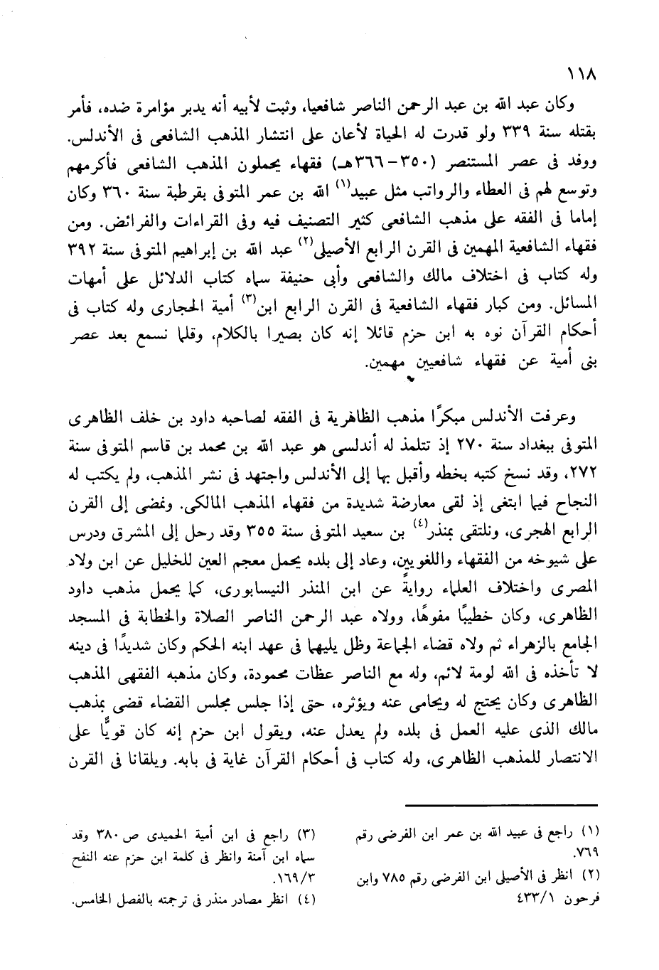 ووفد فى عصر المستنصر (350 - 366 هـ) فقهاء يحملون المذهب الشافعى فأكرمهم وتوسع لهم فى العطاء والرواتب مثل عبيد (¬1) الله بن عمر المتوفى بقرطبة سنة 360 وكان إماما فى الفقه على مذهب الشافعى كثير التصنيف فيه وفى القراءات والفرائض. ومن فقهاء الشافعية المهمين فى القرن الرابع الأصيلى (¬2) عبد الله بن إبراهيم المتوفى سنة 392 وله كتاب فى اختلاف مالك والشافعى وأبى حنيفة سماه كتاب الدلائل على أمهات المسائل. ومن كبار فقهاء الشافعية فى القرن الرابع ابن (¬3) أمية الحجارى وله كتاب فى أحكام القرآن نوه به ابن حزم قائلا إنه كان بصيرا بالكلام، وقلما نسمع بعد عصر بنى أمية عن فقهاء شافعيين مهمين.