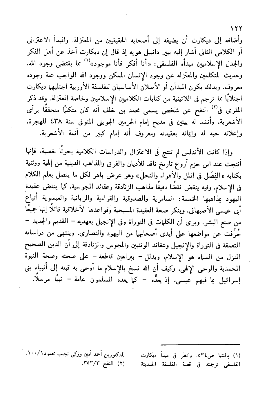 وأضافه إلى ديكارت أن يضيفه إلى أصحابه الحقيقيين من المعتزلة. والمبدأ الاعتزالى أو الكلامى الثانى أشار إليه بيير دانييل هويه إذ قال إن ديكارت أخذ عن أهل الفكر والجدل الإسلاميين مبدأه الفلسفى: «أنا أفكر فأنا موجود» (¬1) مما يقتضى وجود الله، وحديث المتكلمين والمعتزلة عن وجود الإنسان الممكن ووجود الله الواجب علة وجوده معروف. وبذلك يكون المبدآن أو الأصلان الأساسيان للفلسفة الأوربية اجتلبهما ديكارت اجتلابا مما ترجم فى اللاتينية من كتابات الكلاميين الإسلاميين وخاصة المعتزلة. وقد ذكر المقرى فى (¬2) النفح عن شخص يسمى محمد بن خلف أنه كان متكلما متحققا برأى الأشعرية، وأنشد له بيتين فى مديح إمام الحرمين الجوينى المتوفى سنة 438 للهجرة، وإعلانه حبه له وإيمانه بعقيدته ومعروف أنه إمام كبير من أئمة الأشعرية.