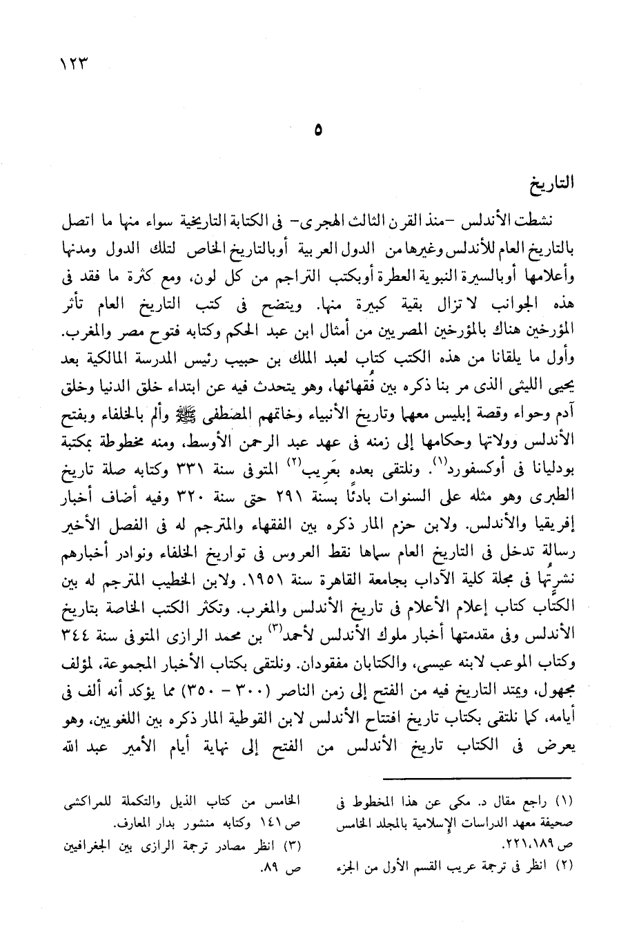 وأول ما يلقانا من هذه الكتب كتاب لعبد الملك بن حبيب رئيس المدرسة المالكية بعد يحيى الليثى الذى مر بنا ذكره بين فقهائها، وهو يتحدث فيه عن ابتداء خلق الدنيا وخلق آدم وحواء وقصة إبليس معهما وتاريخ الأنبياء وخاتمهم المصطفى صلّى الله عليه وسلّم وألم بالخلفاء وبفتح الأندلس وولاتها وحكامها إلى زمنه فى عهد عبد الرحمن الأوسط، ومنه مخطوطة بمكتبة بودليانا فى أوكسفورد (¬1). ونلتقى بعده بعريب (¬2) المتوفى سنة 331 وكتابه صلة تاريخ الطبرى وهو مثله على السنوات بادئا بسنة 291 حتى سنة 320 وفيه أضاف أخبار إفريقيا والأندلس. ولابن حزم المار ذكره بين الفقهاء والمترجم له فى الفصل الأخير رسالة تدخل فى التاريخ العام سماها نقط العروس فى تواريخ الخلفاء ونوادر أخبارهم نشرتها فى مجلة كلية الآداب بجامعة القاهرة سنة 1951. ولابن الخطيب المترجم له بين الكتّاب كتاب إعلام الأعلام فى تاريخ الأندلس والمغرب. وتكثر الكتب الخاصة بتاريخ الأندلس وفى مقدمتها أخبار ملوك الأندلس لأحمد (¬3) بن محمد الرازى المتوفى سنة 344 وكتاب الموعب لابنه عيسى، والكتابان مفقودان. ونلتقى بكتاب الأخبار المجموعة، لمؤلف مجهول، ويمتد التاريخ فيه من الفتح إلى زمن الناصر (300 - 350) مما يؤكد أنه ألف فى أيامه، كما نلتقى بكتاب تاريخ افتتاح الأندلس لابن القوطية المار ذكره بين اللغويين، وهو يعرض فى الكتاب تاريخ الأندلس من الفتح إلى نهاية أيام الأمير عبد الله