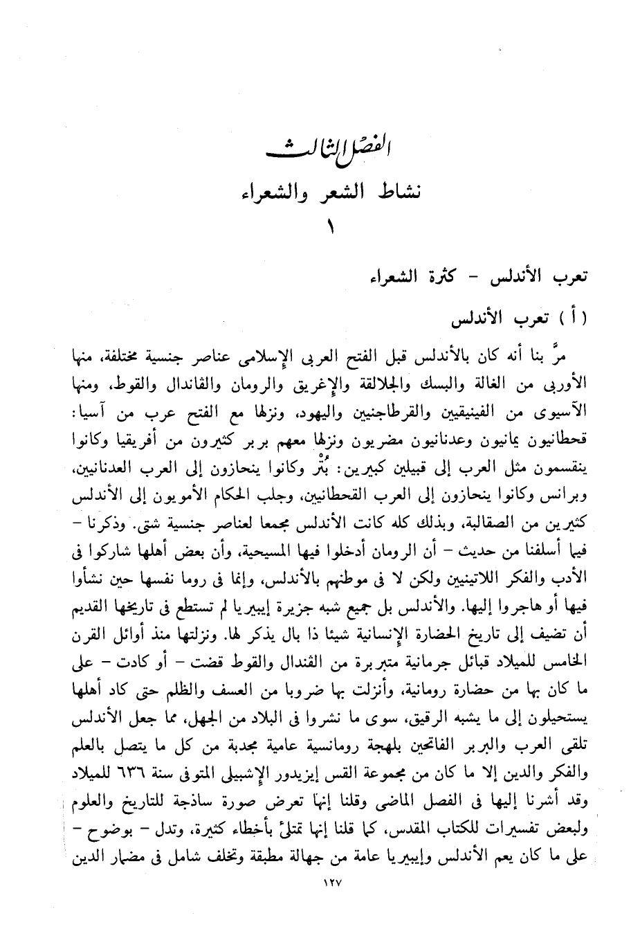 قحطانيون يمانيون وعدنانيون مضريون ونزلها معهم بربر كثيرون من أفريقيا وكانوا ينقسمون مثل العرب إلى قبيلين كبيرين: بتر وكانوا ينحازون إلى العرب العدنانيين، وبرانس وكانوا ينحازون إلى العرب القحطانيين، وجلب الحكام الأمويون إلى الأندلس كثيرين من الصقالبة، وبذلك كله كانت الأندلس مجمعا لعناصر جنسية شتى. وذكرنا- فيما أسلفنا من حديث-أن الرومان أدخلوا فيها المسيحية، وأن بعض أهلها شاركوا فى الأدب والفكر اللاتينيين ولكن لا فى موطنهم بالأندلس، وإنما فى روما نفسها حين نشأوا فيها أو هاجروا إليها. والأندلس بل جميع شبه جزيرة إيبيريا لم تستطع فى تاريخها القديم أن تضيف إلى تاريخ الحضارة الإنسانية شيئا ذا بال يذكر لها. ونزلتها منذ أوائل القرن الخامس للميلاد قبائل جرمانية متبربرة من القندال والقوط قضت-أو كادت-على ما كان بها من حضارة رومانية، وأنزلت بها ضروبا من العسف والظلم حتى كاد أهلها يستحيلون إلى ما يشبه الرقيق، سوى ما نشروا فى البلاد من الجهل، مما جعل الأندلس تلقى العرب والبربر الفاتحين بلهجة رومانسية عامية مجدبة من كل ما يتصل بالعلم والفكر والدين إلا ما كان من مجموعة القس إيزيدور الإشبيلى المتوفى سنة 636 للميلاد وقد أشرنا إليها فى الفصل الماضى وقلنا إنها تعرض صورة ساذجة للتاريخ والعلوم ولبعض تفسيرات للكتاب المقدس، كما قلنا إنها تمتلئ بأخطاء كثيرة، وتدل-بوضوح- على ما كان يعم الأندلس وإيبيريا عامة من جهالة مطبقة وتخلف شامل فى مضمار الدين
