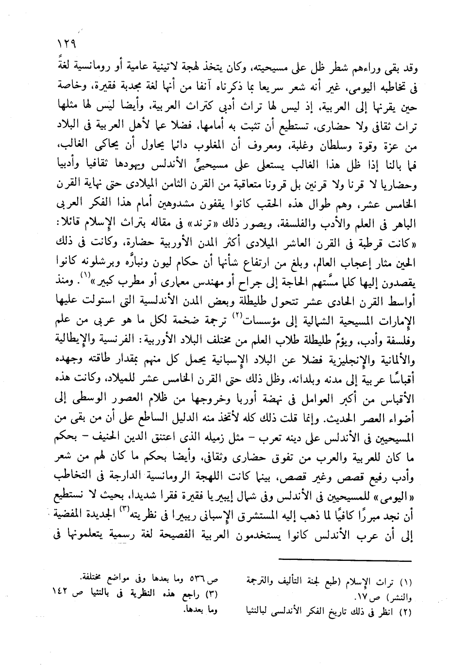 وقد بقى وراءهم شطر ظل على مسيحيته، وكان يتخذ لهجة لاتينية عامية أو رومانثية لغة فى تخاطبه اليومى، غير أنه شعر سريعا بما ذكرناه آنفا من أنها لغة مجدبة فقيرة، وخاصة حين يقرنها إلى العربية، إذ ليس لها تراث أدبى كتراث العربية، وأيضا ليس لها مثلها تراث ثقافى ولا حضارى، تستطيع أن تثبت به أمامها، فضلا عما لأهل العربية فى البلاد من عزة وقوة وسلطان وغلبة، ومعروف أن المغلوب دائما يحاول أن يحاكى الغالب، فما بالنا إذا ظل هذا الغالب يستعلى على مسيحيىّ الأندلس ويهودها ثقافيا وأدبيا وحضاريا لا قرنا ولا قرنين بل قرونا متعاقبة من القرن الثامن الميلادى حتى نهاية القرن الخامس عشر، وهم طوال هذه الحقب كانوا يقفون مشدوهين أمام هذا الفكر العربى الباهر فى العلم والأدب والفلسفة، ويصور ذلك «ترند» فى مقاله بتراث الإسلام قائلا: