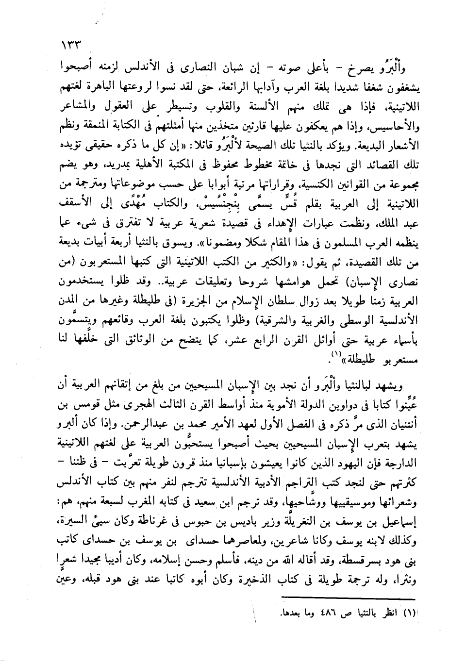 ويشهد لبالنثيا وألبرو أن نجد بين الإسبان المسيحيين من بلغ من إتقانهم العربية أن عيّنوا كتابا فى دواوين الدولة الأموية منذ أواسط القرن الثالث الهجرى مثل قومس بن أنتنيان الذى مرّ ذكره فى الفصل الأول لعهد الأمير محمد بن عبد الرحمن. وإذا كان ألبرو يشهد بتعرب الإسبان المسيحيين بحيث أصبحوا يستحبّون العربية على لغتهم اللاتينية الدارجة فإن اليهود الذين كانوا يعيشون بإسبانيا منذ قرون طويلة تعرّبت-فى ظننا- كثرتهم حتى لنجد كتب التراجم الأدبية الأندلسية تترجم لنفر منهم بين كتاب الأندلس وشعرائها وموسيقييها ووشّاحيها، وقد ترجم ابن سعيد فى كتابه المغرب لسبعة منهم، هم: