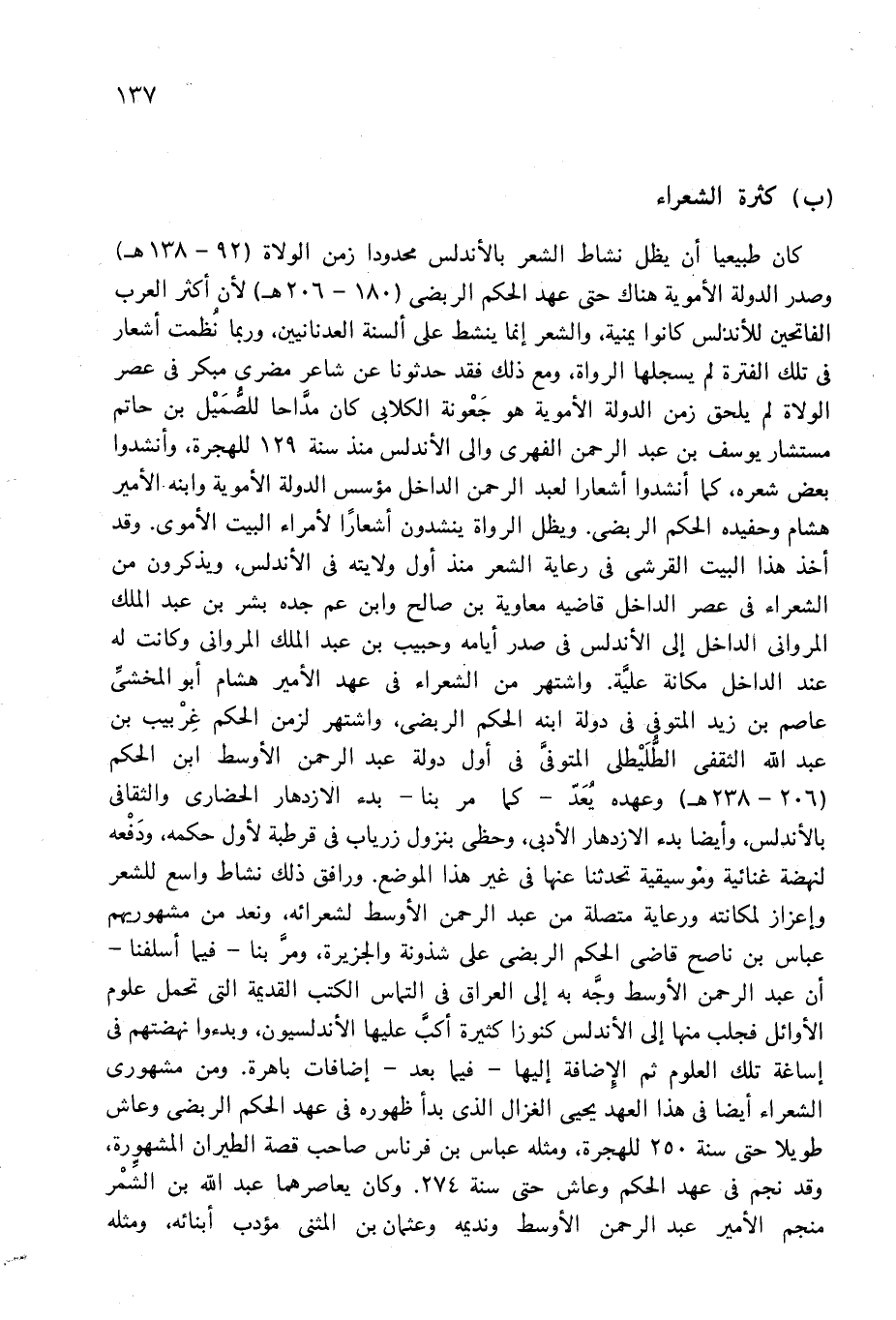 كان طبيعيا أن يظل نشاط الشعر بالأندلس محدودا زمن الولاة (92 - 138 هـ) وصدر الدولة الأموية هناك حتى عهد الحكم الربضى (180 - 206 هـ) لأن أكثر العرب الفاتحين للأندلس كانوا يمنية، والشعر إنما ينشط على ألسنة العدنانيين، وربما نظمت أشعار فى تلك الفترة لم يسجلها الرواة، ومع ذلك فقد حدثونا عن شاعر مضرى مبكر فى عصر الولاة لم يلحق زمن الدولة الأموية هو جعونة الكلابى كان مدّاحا للصّميل بن حاتم مستشار يوسف بن عبد الرحمن الفهرى والى الأندلس منذ سنة 129 للهجرة، وأنشدوا بعض شعره، كما أنشدوا أشعارا لعبد الرحمن الداخل مؤسس الدولة الأموية وابنه الأمير هشام وحفيده الحكم الربضى. ويظل الرواة ينشدون أشعارا لأمراء البيت الأموى. وقد أخذ هذا البيت القرشى فى رعاية الشعر منذ أول ولايته فى الأندلس، ويذكرون من الشعراء فى عصر الداخل قاضيه معاوية بن صالح وابن عم جده بشر بن عبد الملك المروانى الداخل إلى الأندلس فى صدر أيامه وحبيب بن عبد الملك المروانى وكانت له عند الداخل مكانة عليّة. واشتهر من الشعراء فى عهد الأمير هشام أبو المخشىّ عاصم بن زيد المتوفى فى دولة ابنه الحكم الربضى، واشتهر لزمن الحكم غربيب بن عبد الله الثقفى الطّليطلى المتوفّى فى أول دولة عبد الرحمن الأوسط ابن الحكم (206 - 238 هـ) وعهده يعدّ-كما مر بنا-بدء الازدهار الحضارى والثقافى بالأندلس، وأيضا بدء الازدهار الأدبى، وحظى بنزول زرياب فى قرطبة لأول حكمه، ودفعه لنهضة غنائية وموسيقية تحدثنا عنها فى غير هذا الموضع. ورافق ذلك نشاط واسع للشعر وإعزاز لمكانته ورعاية متصلة من عبد الرحمن الأوسط لشعرائه، ونعد من مشهوريهم عباس بن ناصح قاضى الحكم الربضى على شذونة والجزيرة، ومرّ بنا-فيما أسلفنا- أن عبد الرحمن الأوسط وجّه به إلى العراق فى التماس الكتب القديمة التى تحمل علوم الأوائل فجلب منها إلى الأندلس كنوزا كثيرة أكبّ عليها الأندلسيون، وبدءوا نهضتهم فى إساغة تلك العلوم ثم الإضافة إليها-فيما بعد-إضافات باهرة. ومن مشهورى الشعراء أيضا فى هذا العهد يحيى الغزال الذى بدأ ظهوره فى عهد الحكم الربضى وعاش طويلا حتى سنة 250 للهجرة، ومثله عباس بن فرناس صاحب قصة الطيران المشهورة، وقد نجم فى عهد الحكم وعاش حتى سنة 274. وكان يعاصرهما عبد الله بن الشّمر منجم الأمير عبد الرحمن الأوسط ونديمه وعثمان بن المثنى مؤدب أبنائه، ومثله