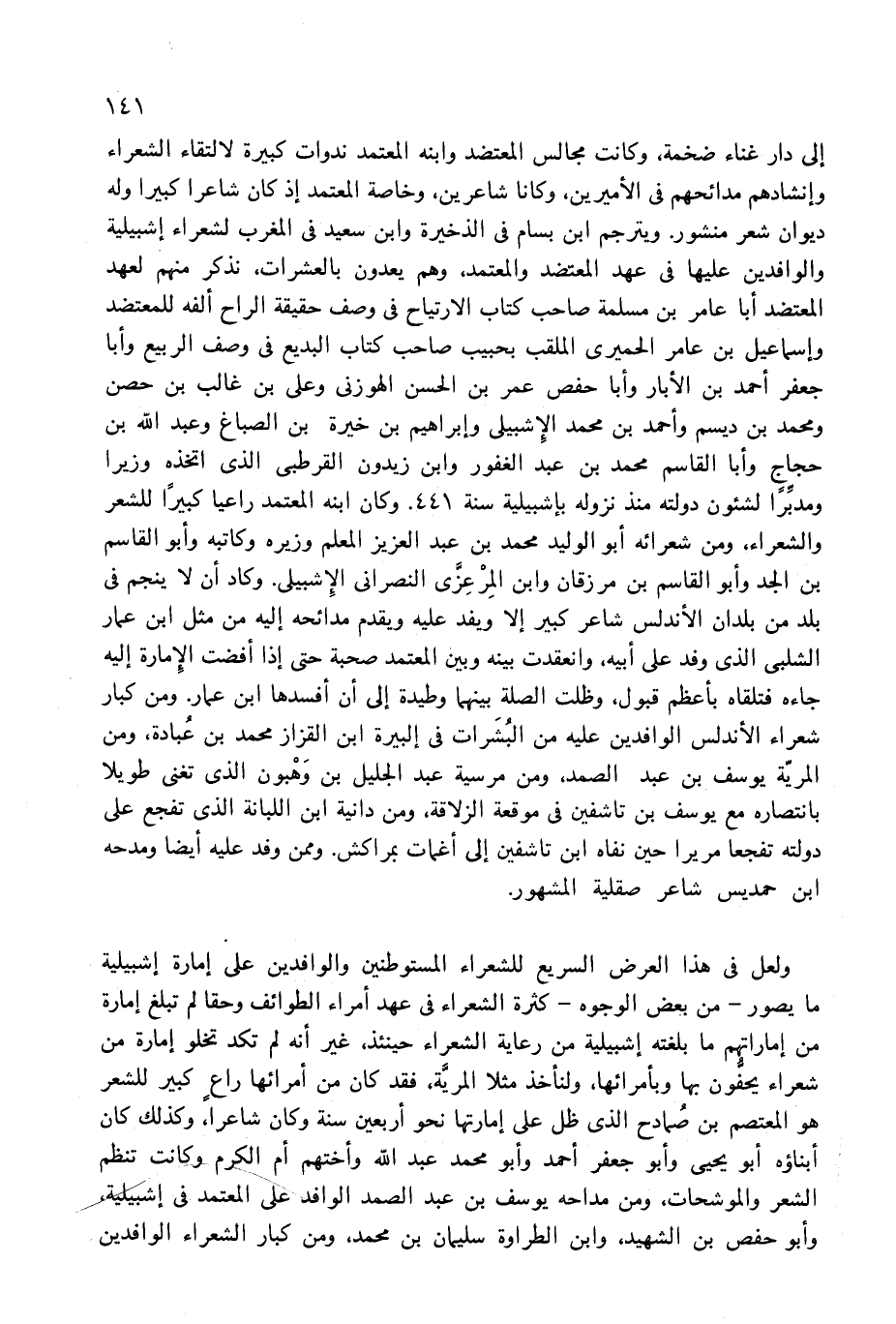 إلى دار غناء ضخمة، وكانت مجالس المعتضد وابنه المعتمد ندوات كبيرة لالتقاء الشعراء وإنشادهم مدائحهم فى الأميرين، وكانا شاعرين، وخاصة المعتمد إذ كان شاعرا كبيرا وله ديوان شعر منشور. ويترجم ابن بسام فى الذخيرة وابن سعيد فى المغرب لشعراء إشبيلية والوافدين عليها فى عهد المعتضد والمعتمد، وهم يعدون بالعشرات، نذكر منهم لعهد المعتضد أبا عامر بن مسلمة صاحب كتاب الارتياح فى وصف حقيقة الراح ألفه للمعتضد وإسماعيل بن عامر الحميرى الملقب بحبيب صاحب كتاب البديع فى وصف الربيع وأبا جعفر أحمد بن الأبار وأبا حفص عمر بن الحسن الهوزنى وعلى بن غالب بن حصن ومحمد بن ديسم وأحمد بن محمد الإشبيلى وإبراهيم بن خيرة بن الصباغ وعبد الله بن حجاج وأبا القاسم محمد بن عبد الغفور وابن زيدون القرطبى الذى اتخذه وزيرا ومدبّرا لشئون دولته منذ نزوله بإشبيلية سنة 441. وكان ابنه المعتمد راعيا كبيرا للشعر والشعراء، ومن شعرائه أبو الوليد محمد بن عبد العزيز المعلم وزيره وكاتبه وأبو القاسم بن الجد وأبو القاسم بن مرزقان وابن المرعزّى النصرانى الإشبيلى. وكاد أن لا ينجم فى بلد من بلدان الأندلس شاعر كبير إلا ويفد عليه ويقدم مدائحه إليه من مثل ابن عمار الشلبى الذى وفد على أبيه، وانعقدت بينه وبين المعتمد صحبة حتى إذا أفضت الإمارة إليه جاءه فتلقاه بأعظم قبول، وظلت الصلة بينهما وطيدة إلى أن أفسدها ابن عمار. ومن كبار شعراء الأندلس الوافدين عليه من البشرات فى إلبيرة ابن القزاز محمد بن عبادة، ومن المريّة يوسف بن عبد الصمد، ومن مرسية عبد الجليل بن وهبون الذى تغنى طويلا بانتصاره مع يوسف بن تاشفين فى موقعة الزلاقة، ومن دانية ابن اللبانة الذى تفجع على دولته تفجعا مريرا حين نفاه ابن تاشفين إلى أغمات بمراكش. وممن وفد عليه أيضا ومدحه ابن حمديس شاعر صقلية المشهور.