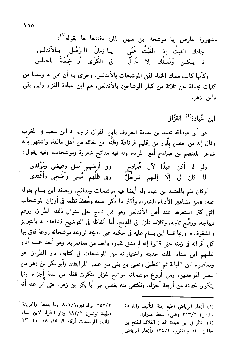 (¬2) انظر فى ابن عبادة القزاز القلائد للفتح بن خاقان: 14 والمغرب 2/ 134 وأزهار الرياض 2/ 252 والذخيرة 1/ 801 وما بعدها والخريدة (طبعة تونس) 2/ 182 ودار الطراز لابن سناء الملك: الموشحات أرقام 9، 15، 18، 21، 23