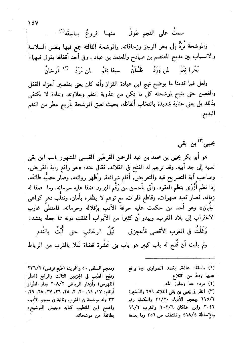 (¬3) انظر فى يحيى بن بقى القلائد 279 والذخيرة 2/ 615 ومعجم الأدباء 20/ 21 والتكملة رقم 2042 وابن خلكان 6/ 202 والمغرب 2/ 19 والإحاطة 4/ 418 والمقتطف ص 256 وما بعدها ومعجم السلفى 50 والحريدة (طبع تونس) 2/ 236 ونفح الطيب فى الجزءين الثالث والرابع (انظر الفهرس) وأزهار الرياض 2/ 208 ودار الطراز أرقام: 17، 19، 20، 2، 25، 26، 27، 28، 29، 33 وله موشحة فى المغرب وثانية فى معجم الأدباء وافتتح ابن الخطيب كتابه «جيش التوشيح» بطائفة من موشحاته.