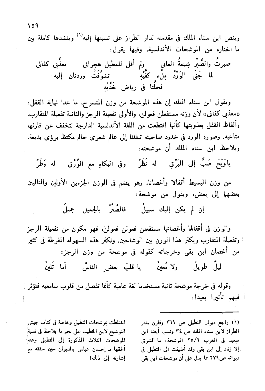 (¬1) راجع ديوان التطيلى ص 269 وقارن بدار الطراز لابن سناء الملك ص 34 ونسب أيضا ابن سعيد فى المغرب 2/ 25 الموشحة: ما الشوق إلا زناد إلى ابن بقى وقد أضيفت الى التطيلى فى ديوانه ص 279 مما يدل على أن موشحات ابن بقى اختلطت بموشحات التطيلى وخاصة فى كتاب جيش التوشيح لابن الخطيب على نحو ما يلاحظ فى نسبة الموشحات الثلاث المذكورة إلى التطيلى وعنه ألحقها د. إحسان عباس بالديوان حين حققه مع إشارته إلى ذلك!