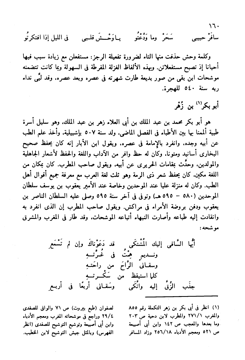 (¬1) انظر فى أبى بكر بن زهر التكملة رقم 855 والمغرب 1/ 271 والمطرب لابن دحية ص 203 وما بعدها والمعجب ص 142 وابن أبى أصيبعة ص 521 ومعجم الأدباء 18/ 256 وزاد المسافر لصفوان (طبع بيروت) ص 71 والوافى للصفدى 4/ 29 وراجع فى موشحاته المغرب ومعجم الأدباء وابن أبى أصيبعة وتوشيع التوشيح للصفدى (انظر الفهرس) وبالمثل جيش التوشيح لابن الخطيب.