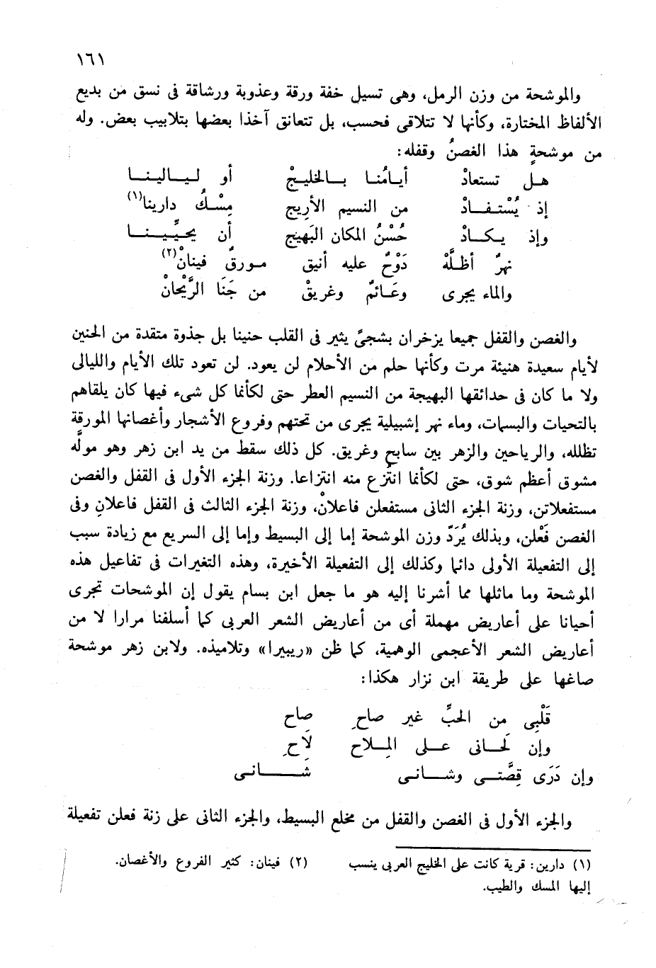 والغصن والقفل جميعا يزخران بشجىّ يثير فى القلب حنينا بل جذوة متقدة من الحنين لأيام سعيدة هنيئة مرت وكأنها حلم من الأحلام لن يعود. لن تعود تلك الأيام والليالى ولا ما كان فى حدائقها البهيجة من النسيم العطر حتى لكأنما كل شئ فيها كان يلقاهم بالتحيات والبسمات، وماء نهر إشبيلية يجرى من تحتهم وفروع الأشجار وأغصانها المورقة تظلله، والرياحين والزهر بين سابح وغريق. كل ذلك سقط من يد ابن زهر وهو مولّه مشوق أعظم شوق، حتى لكأنما انتزع منه انتزاعا. وزنة الجزء الأول فى القفل والغصن مستفعلاتن، وزنة الجزء الثانى مستفعلن فاعلان، وزنة الجزء الثالث فى القفل فاعلان وفى الغصن فعلن، وبذلك يردّ وزن الموشحة إما إلى البسيط وإما إلى السريع مع زيادة سبب إلى التفعيلة الأولى دائما وكذلك إلى التفعيلة الأخيرة، وهذه التغيرات فى تفاعيل هذه الموشحة وما ماثلها مما أشرنا إليه هو ما جعل ابن بسام يقول إن الموشحات تجرى أحيانا على أعاريض مهملة أى من أعاريض الشعر العربى كما أسلفنا مرارا لا من أعاريض الشعر الأعجمى الوهمية، كما ظن «ريبيرا» وتلاميذه. ولابن زهر موشحة صاغها على طريقة ابن نزار هكذا: