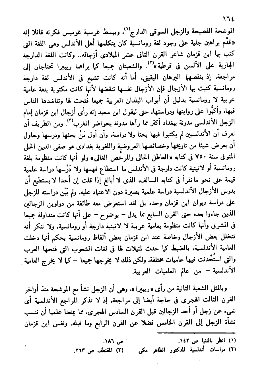 الموشحة الفصيحة والزجل السوقى الدارج (¬1)، ويبسط غرسية غوميس فكرته قائلا إنه «قدّم براهين جلية على وجود لغة رومانثية كان يتكلمها أهل الأندلس وهى اللغة التى كتب بها ابن قزمان شاعر القرن الثانى عشر الميلادى أزجاله. . وكانت اللغة الدارجة الجارية على الألسن فى قرطبة» (¬2). والشعبتان جميعا كما يراهما ريبيرا تحتاجان إلى مراجعة، إذ ينقصهما البرهان اليقينى، أما أنه كانت تشيع فى الأندلس لغة دارجة رومانثية كتبت بها الأزجال فإن الأزجال نفسها تنقضها لأنها كانت مكتوبة بلغة عامية عربية لا رومانثية بدليل أن أبواب البلدان العربية جميعا فتحت لها وتناشدها الناس فيها، وأكبّوا على روايتها ودراستها، حتى ليقول ابن سعيد إنه رأى أزجال ابن قزمان إمام الزجل الأندلسى مدونة ببغداد أكثر مما رآها مدونة بحواضر المغرب (¬3). ومن الطريف أن نعرف أن الأندلسيين لم يكتبوا فيها بحثا ولا دراسة، وأن أول من بحثها ودرسها وحاول أن يعرض شيئا من تاريخها وخصائصها العروضية واللغوية بغدادى هو صفى الدين الحلى المتوفى سنة 750 فى كتابه «العاطل الحالى والمرخّص الغالى» ولو أنها كانت منظومة بلغة رومانثية أو لاتينية كانت دارجة فى الأندلس ما استطاع فهمها ولا درسها دراسة علمية قيمة على نحو ما نقرأ فى كتابه السالف، الذى لا أبالغ إذا قلت إن أحدا لا يستطيع أن يدرس الأزجال الأندلسية دراسة علمية بصيرة دون الاعتماد عليه. ولم يبن دراسته للزجل على دراسة ديوان ابن قزمان وحده بل لقد استعرض معه طائفة من دواوين الزجالين الذين جاءوا بعده حتى القرن السابع مما يدل-بوضوح-على أنها كانت متداولة جميعا فى المشرق وأنها كانت منظومة بعامية عربية لا لاتينية دارجة أو رومانثية، ولا ننكر أنه تتخلل بعض الأزجال وخاصة عند ابن قزمان بعض ألفاظ رومانثية بحكم أنها دخلت العامية الأندلسية، بالضبط كما حدث لمثيلات لها فى لغات الشعوب التى فتحها العرب والتى استحدثت فيها عاميات مختلفة، ولكن ذلك لا يخرجها جميعا-كما لا يخرج العامية الأندلسية-من عالم العاميات العربية.