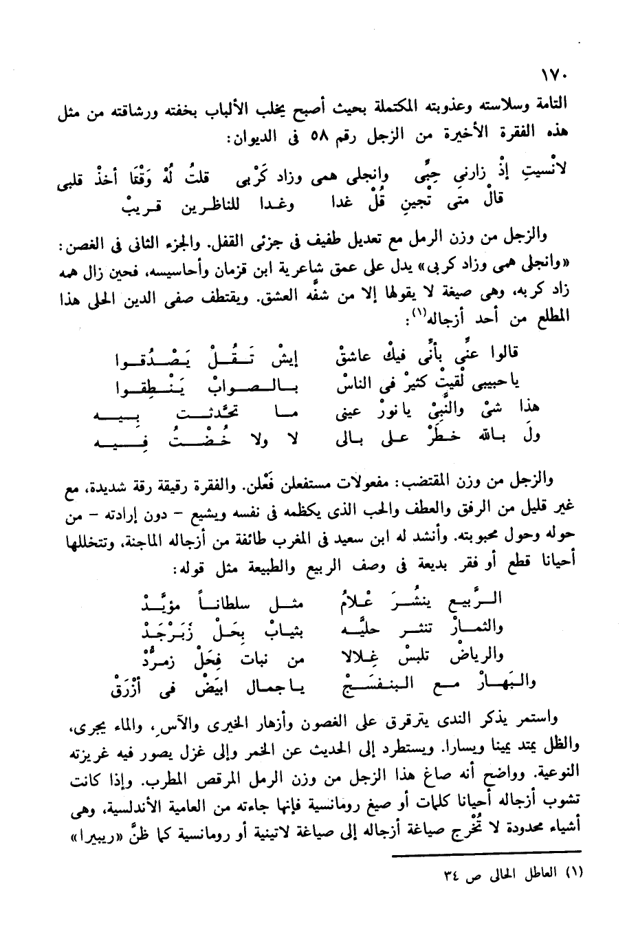 والزجل من وزن المقتضب: مفعولات مستفعلن فعلن. والفقرة رقيقة رقة شديدة، مع غير قليل من الرفق والعطف والحب الذى يكظمه فى نفسه ويشيع-دون إرادته-من حوله وحول محبوبته. وأنشد له ابن سعيد فى المغرب طائفة من أزجاله الماجنة، وتتخللها أحيانا قطع أو فقر بديعة فى وصف الربيع والطبيعة مثل قوله: