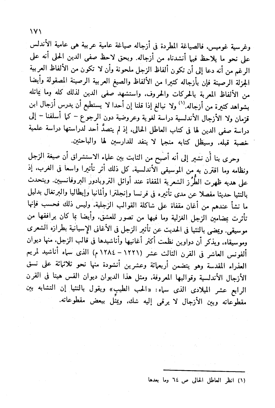 وغرسية غوميس، فالصياغة المطردة فى أزجاله صياغة عامية عربية هى عامية الأندلس على نحو ما يلاحظ فيما أنشدناه من أزجاله. وبحق لا حظ صفى الدين الحلى أنه على الرغم من أنه دعا إلى أن تكون ألفاظ الزجل ملحونة وأن لا تكون من الألفاظ العربية الجزلة الرصينة فإن بأزجاله كثيرا من الألفاظ والصيغ العربية الرصينة المصقولة وأيضا من الألفاظ المعربة بالحركات والحروف، واستشهد صفى الدين لذلك كله وما يماثله بشواهد كثيرة من أزجاله. (¬1) ولا نبالغ إذا قلنا إن أحدا لا يستطيع أن يدرس أزجال ابن قزمان ولا الأزجال الأندلسية دراسة لغوية وعروضية دون الرجوع-كما أسلفنا-إلى دراسة صفى الدين لها فى كتاب العاطل الحالى، إذ لم يتصدّ أحد لدراستها دراسة علمية خصبة قبله، وسيظل كتابه منجما لا ينفد للدارسين لها والباحثين.