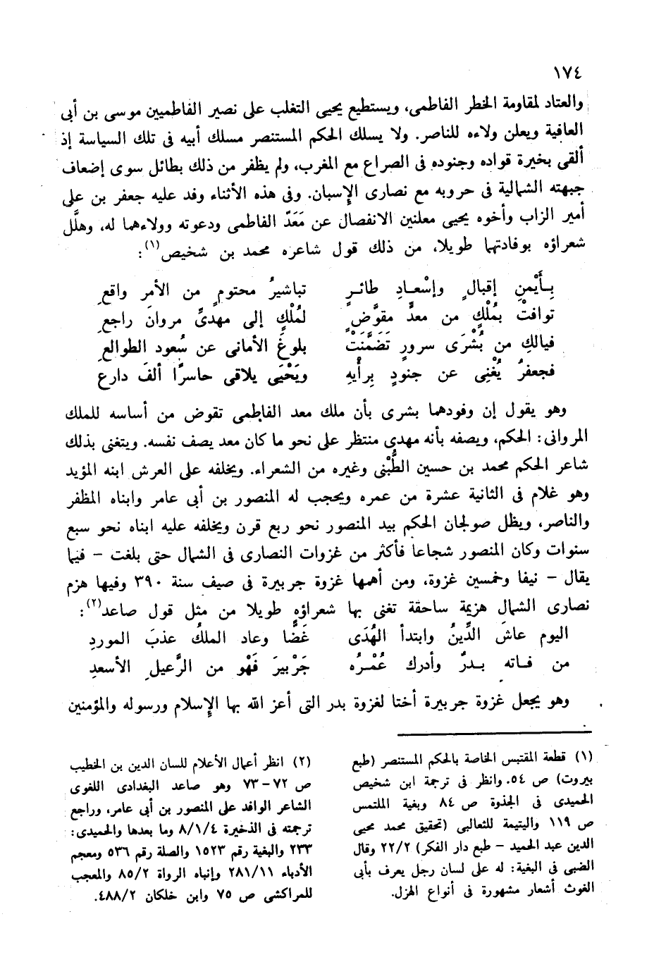 والعتاد لمقاومة الخطر الفاطمى، ويستطيع يحيى التغلب على نصير الفاطميين موسى بن أبى العافية ويعلن ولاءه للناصر. ولا يسلك الحكم المستنصر مسلك أبيه فى تلك السياسة إذ ألقى بخيرة قواده وجنوده فى الصراع مع المغرب، ولم يظفر من ذلك بطائل سوى إضعاف جبهته الشمالية فى حروبه مع نصارى الإسبان. وفى هذه الأثناء وفد عليه جعفر بن على أمير الزاب وأخوه يحيى معلنين الانفصال عن معدّ الفاطمى ودعوته وولاءهما له، وهلّل شعراؤه بوفادتهما طويلا، من ذلك قول شاعره محمد بن شخيص (¬1):