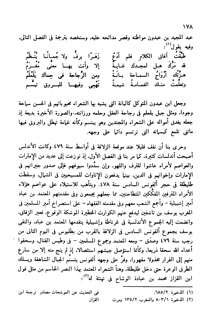 وحرى بنا أن نقف قليلا عند موقعة الزلاقة فى أواسط سنة 479 وكانت الأندلس أصبحت أندلسات كثيرة، كما مر بنا فى الفصل الأول، إذ توزعت إلى عديد من الإمارات والعواصم لأمراء عاشوا للترف واللهو، وإن سدّدوا سيوفهم فإلى صدور جيرانهم فى الإمارات وإخوانهم فى الدين، بينما يدفعون الإتاوات للمسيحيين فى الشمال، وسقطت طليطلة فى حجر ألفونس السادس سنة 478. ويتأهب للاستيلاء على عواصم هؤلاء الأمراء المترفين المفكّكين المتطاحنين، مما جعلهم يجمعون وفى مقدمتهم المعتمد بن عباد أمير إشبيلية-وأجمع الشعب معهم وفى مقدمته الفقهاء-على استصراخ أمير المسلمين فى المغرب يوسف بن تاشفين ليدفع عنهم الكوارث الخطيرة الموشكة الوقوع، فعبر الزقاق، وانضمت إليه الجموع الأندلسية فى غرناطة وإشبيلية يتقدمها المعتمد بن عباد، والتقى يوسف بجموع ألفونس السادس فى الزلاقة بالقرب من بطليوس فى اليوم الثانى من رجب سنة 479 وصدق-ومعه المعتمد وجموع المسلمين-فى وطيس القتال، وسحقوا أعداء الله سحقا ذريعا، وكأنما استؤصل جيشهم استئصالا، إذ لم ينج منه إلا من سارع منهم إلى الفرار مخذولا مقهورا، وفرّ على وجهه ألفونس يتسنّم الجبال الشاهقة ويسلك الطرق الوعرة حتى دخل طليطلة، وهنأ الشعراء المعتمد بهذا النصر الحاسم من مثل قول ابن القزاز محمد بن عبادة الوشاح فى تهنئة له (¬2):