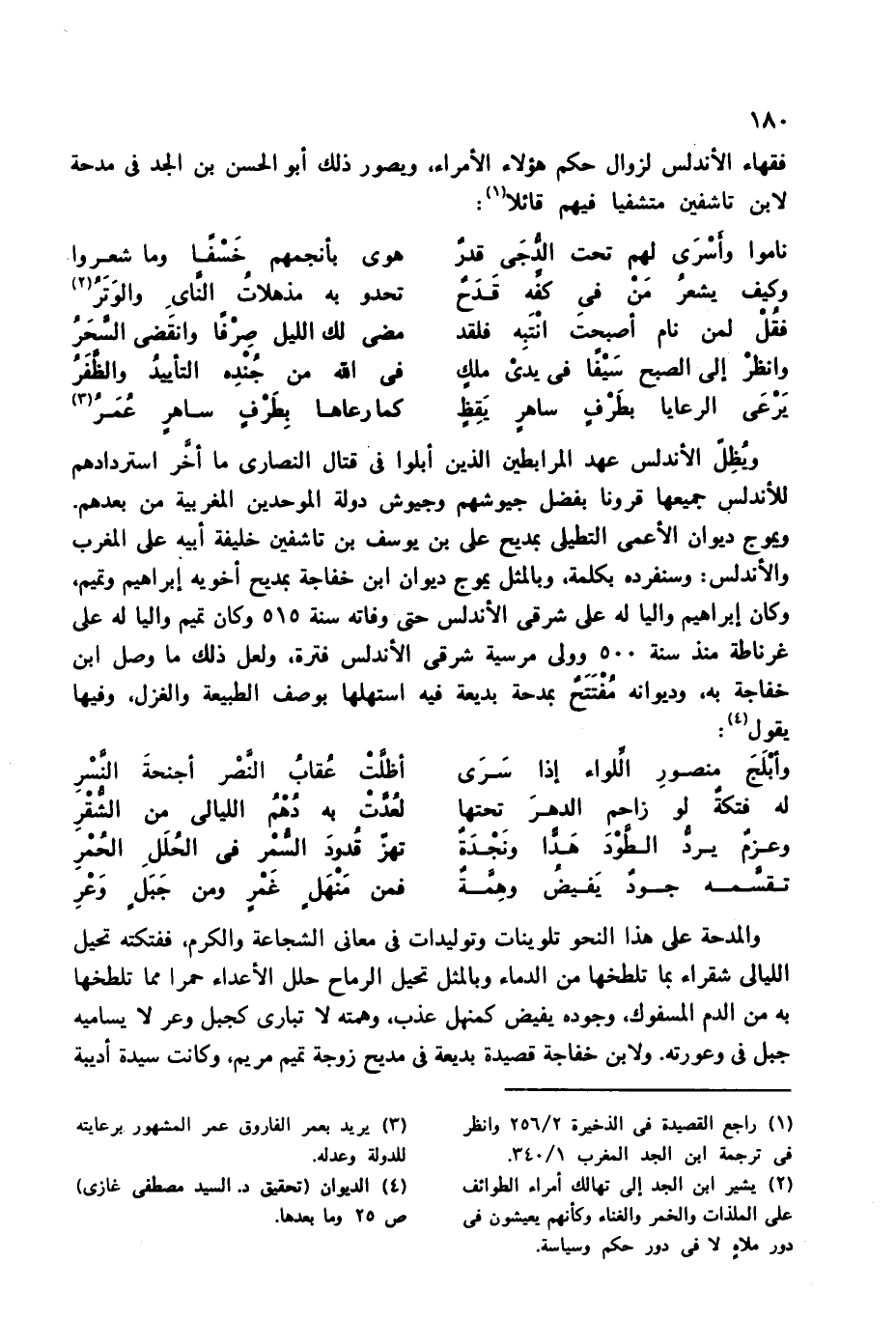ويموج ديوان الأعمى التطيلى بمديح على بن يوسف بن تاشفين خليفة أبيه على المغرب والأندلس: وسنفرده بكلمة، وبالمثل يموج ديوان ابن خفاجة بمديح أخويه إبراهيم وتميم، وكان إبراهيم واليا له على شرقى الأندلس حتى وفاته سنة 515 وكان تميم واليا له على غرناطة منذ سنة 500 وولى مرسية شرقى الأندلس فترة، ولعل ذلك ما وصل ابن خفاجة به، وديوانه مفتتح بمدحة بديعة فيه استهلها بوصف الطبيعة والغزل، وفيها يقول (¬4):