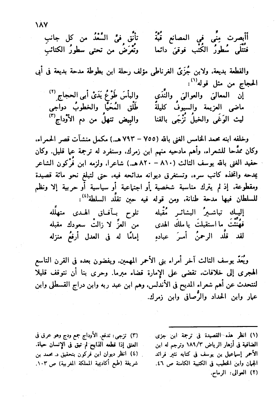 (¬1) انظر هذه القصيدة فى ترجمة ابن جزى الضافية فى أزهار الرياض 3/ 189 وترجم له ابن الأحمر إسماعيل بن يوسف فى كتابه نثير فرائد الجمان وابن الخطيب فى الكتيبة الكامنة ص 46.