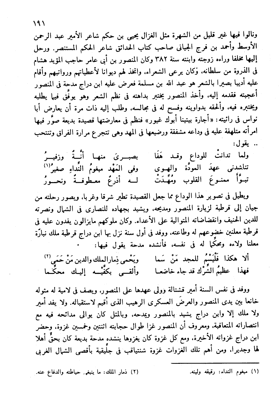 ويطيل فى تصوير هذا الوداع مما جعل القصيدة تطير شرقا وغربا، ويصور رحلته من جيان إلى قرطبة لزيارة المنصور ومديحه، ويشيد بجهاده للنصارى فى الشمال ونصرته للدين الحنيف وانقضاضاته المتوالية على الأعداء. وكان ملوكهم ما يزالون يفدون عليه فى قرطبة معلنين خضوعهم له وطاعته، ووفد فى أول سنة نزل بها ابن دراج قرطبة ملك نبارّة معلنا ولاءه ومحكّما له فى نفسه، فأنشده مدحة يقول فيها: