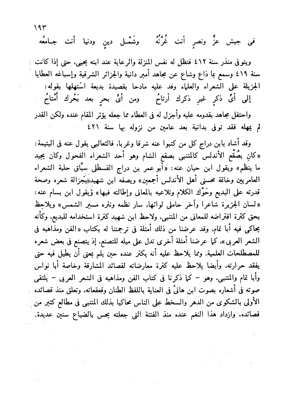 «لسان الجزيرة شاعرا وآخر حاملى لوائها، سار نظمه ونثره مسير الشمس» ويلاحظ بحق كثرة اقتراضه للمعانى من المتنبى، ولا حظ ابن شهيد كثرة استخدامه للبديع، وكأنه يحاكى فيه أبا تمام، وقد عرضنا من ذلك أمثلة فى ترجمتنا له بكتاب «الفن ومذاهبه فى الشعر العربى»، كما عرضنا أمثلة أخرى تدل على ميله للتصنع، إذ يتصنع فى بعض شعره للمصطلحات العلمية. ومما يلاحظ عليه أنه يكثر عنده حين يلم بمعنى أن يطيل فيه حتى يفقد حرارته، وأيضا يلاحظ عليه كثرة معارضاته لقصائد المشارقة وخاصة أبا نواس وأبا تمام والمتنبى، وهو-كما ذكرنا فى كتاب الفن ومذاهبه فى الشعر العربى-يلتقى صوته فى أشعاره بصوت ابن هانئ فى العناية باللفظ الطنان وقعقعاته، وتعلق منذ قصائده الأولى بالشكوى من الدهر والسخط على الناس محاكيا بذلك المتنبى فى مطالع كثير من قصائده، وازداد هذا النغم عنده منذ الفتنة التى جعلته يحس بالضياع سنين عديدة.