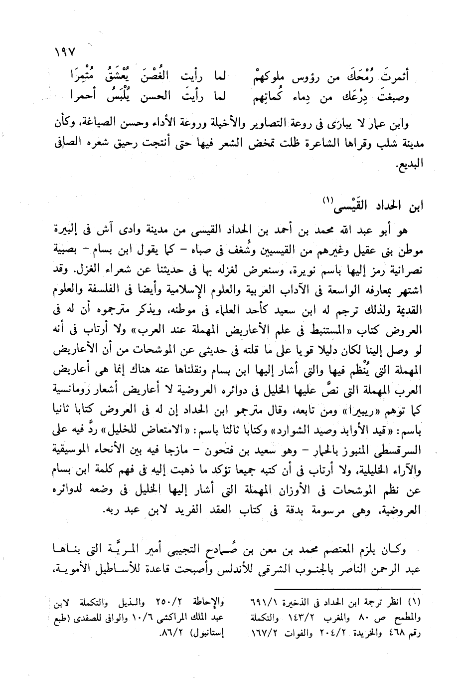 (¬1) انظر ترجمة ابن الحداد فى الذخيرة 1/ 691 والمطمح ص 80 والمغرب 2/ 143 والتكملة رقم 468 والخريدة 2/ 204 والفوات 2/ 167 والإحاطة 2/ 250 والذيل والتكملة لابن عبد الملك المراكشى 6/ 10 والوافى للصفدى (طبع إستانبول) 2/ 86.