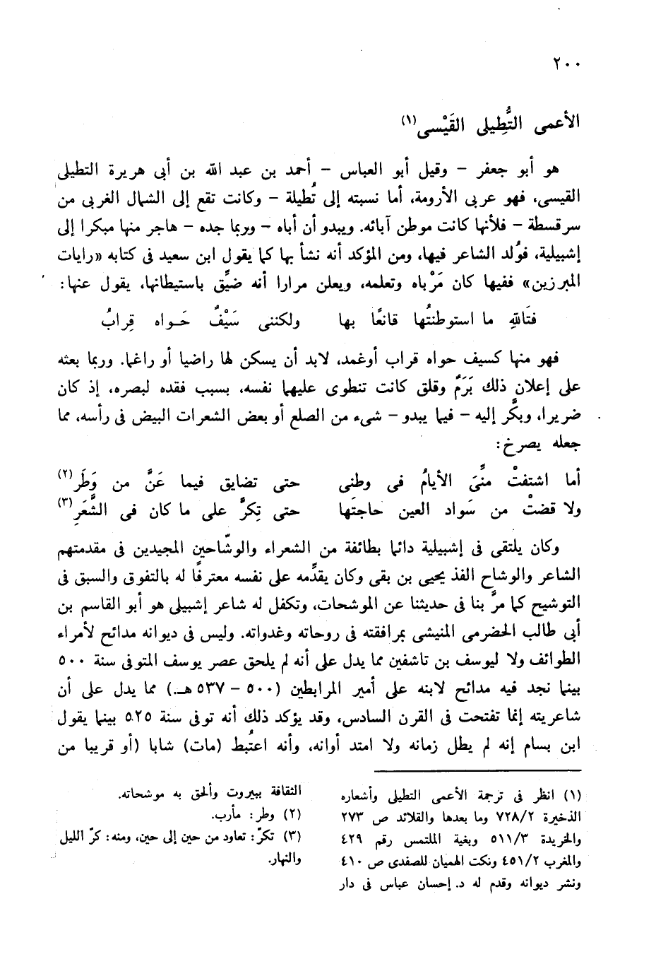 (¬1) انظر فى ترجمة الأعمى التطيلى وأشعاره الذخيرة 2/ 728 وما بعدها والقلائد ص 273 والخريدة 3/ 511 وبغية الملتمس رقم 429 والمغرب 2/ 451 ونكت الهميان للصفدى ص 410 ونشر ديوانه وقدم له د. إحسان عباس فى دار الثقافة ببيروت وألحق به موشحاته.