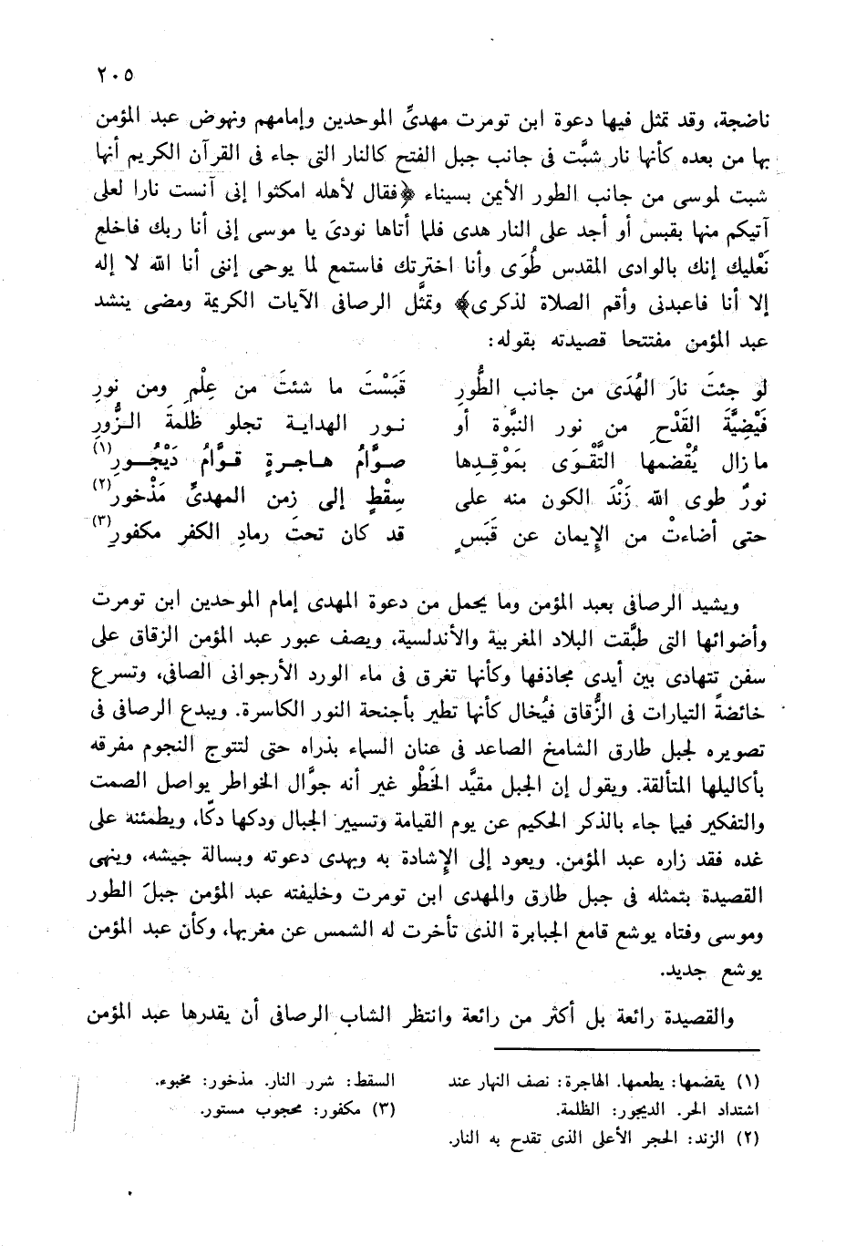 ناضجة، وقد تمثل فيها دعوة ابن تومرت مهدىّ الموحدين وإمامهم ونهوض عبد المؤمن بها من بعده كأنها نار شبّت فى جانب جبل الفتح كالنار التى جاء فى القرآن الكريم أنها شبت لموسى من جانب الطور الأيمن بسيناء {فَقالَ لِأَهْلِهِ اُمْكُثُوا إِنِّي آنَسْتُ ناراً لَعَلِّي آتِيكُمْ مِنْها بِقَبَسٍ أَوْ أَجِدُ عَلَى النّارِ هُدىً فَلَمّا أَتاها نُودِيَ يا مُوسى إِنِّي أَنَا رَبُّكَ فَاخْلَعْ نَعْلَيْكَ إِنَّكَ بِالْوادِ الْمُقَدَّسِ طُوىً وَأَنَا اِخْتَرْتُكَ فَاسْتَمِعْ لِما يُوحى إِنَّنِي أَنَا اللهُ لا إِلهَ إِلاّ أَنَا فَاعْبُدْنِي وَأَقِمِ الصَّلاةَ لِذِكْرِي} وتمثّل الرصافى الآيات الكريمة ومضى ينشد عبد المؤمن مفتتحا قصيدته بقوله: