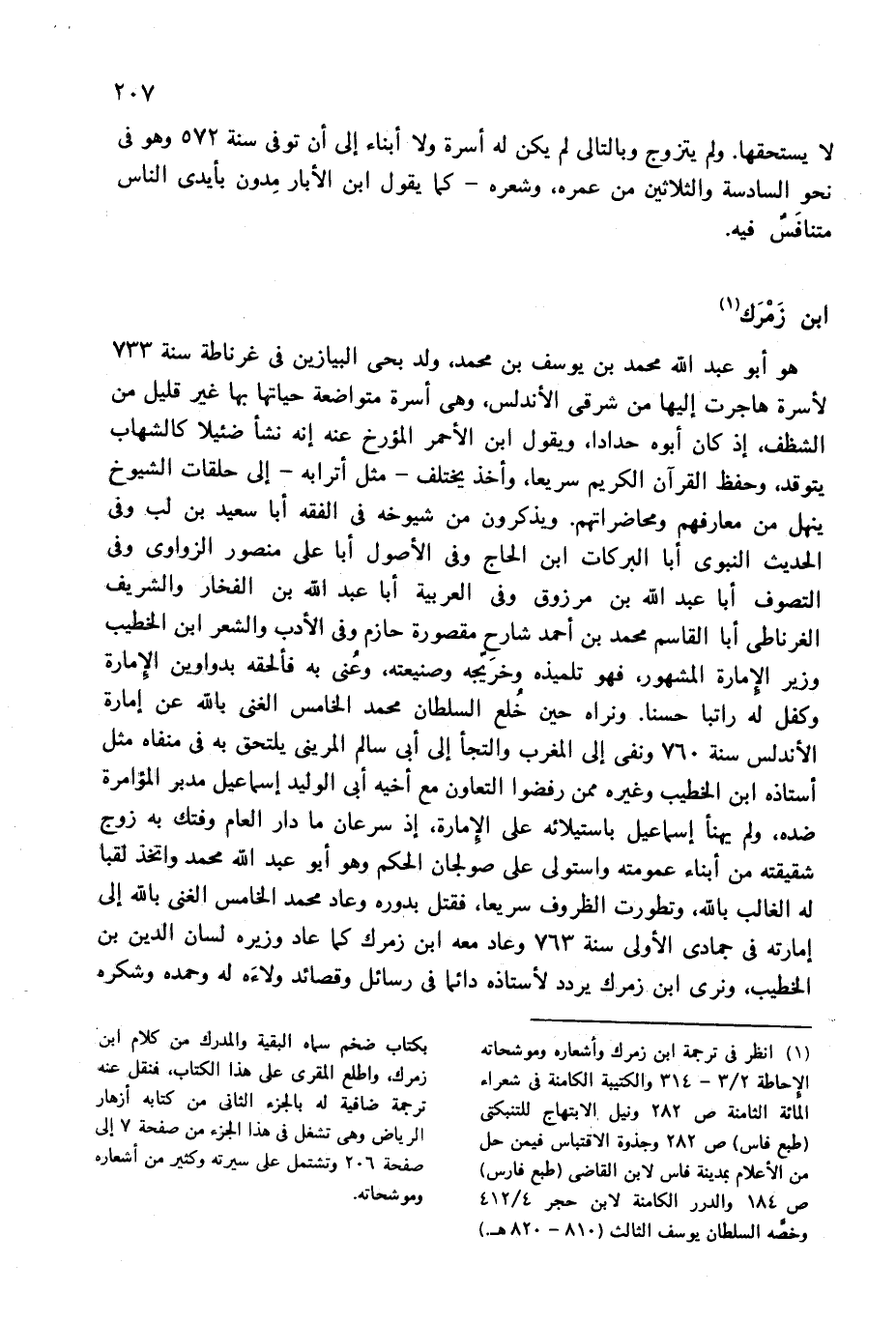 (¬1) انظر فى ترجمة ابن زمرك وأشعاره وموشحاته الإحاطة 2/ 3 - 314 والكتيبة الكامنة فى شعراء المائة الثامنة ص 282 ونيل الابتهاج للتنبكتى (طبع فاس) ص 282 وجذوة الاقتباس فيمن حل من الأعلام بمدينة فاس لابن القاضى (طبع فارس) ص 184 والدرر الكامنة لابن حجر 4/ 412 وخصّه السلطان يوسف الثالث (810 - 820 هـ.) بكتاب ضخم سماه البقية والمدرك من كلام ابن زمرك، واطلع المقرى على هذا الكتاب، فنقل عنه ترجمة ضافية له بالجزء الثانى من كتابه أزهار الرياض وهى تشغل فى هذا الجزء من صفحة 7 إلى صفحة 206 وتشتمل على سيرته وكثير من أشعاره وموشحاته.