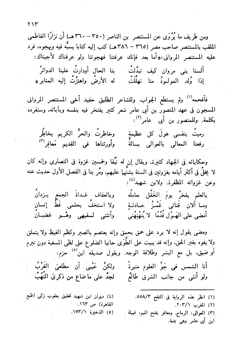 فأفحمه (¬1) ولم يستطع الجواب. وللشاعر الطليق حفيد أخى المستنصر المروانى المسجون فى عهد المنصور بن أبى عامر شعر كثير يفتخر فيه بنفسه وبآبائه، وسنفرده بكلمة. وللمنصور بن أبى عامر (¬2):