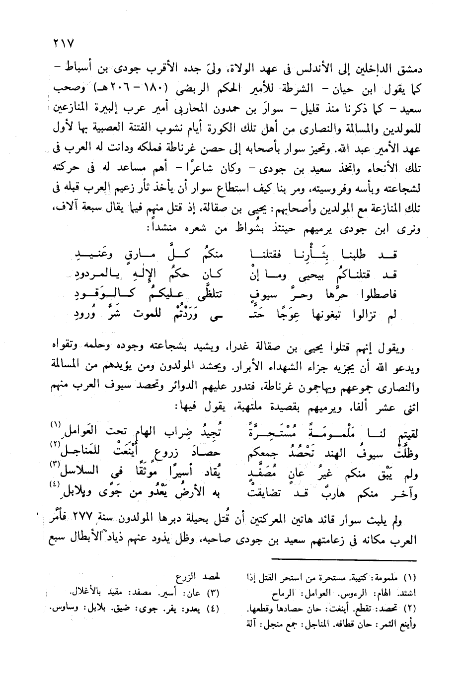 دمشق الداخلين إلى الأندلس فى عهد الولاة، ولى جده الأقرب جودى بن أسباط- كما يقول ابن حيان-الشرطة للأمير الحكم الربضى (180 - 206 هـ) وصحب سعيد-كما ذكرنا منذ قليل-سوار بن حمدون المحاربى أمير عرب إلبيرة المنازعين للمولدين والمسالمة والنصارى من أهل تلك الكورة أيام نشوب الفتنة العصبية بها لأول عهد الأمير عبد الله. وتحيز سوار بأصحابه إلى حصن غرناطة فملكه ودانت له العرب فى تلك الأنحاء واتخذ سعيد بن جودى-وكان شاعرا-أهم مساعد له فى حركته لشجاعته وبأسه وفروسيته، ومر بنا كيف استطاع سوار أن يأخذ ثأر زعيم العرب قبله فى تلك المنازعة مع المولدين وأصحابهم: يحيى بن صقالة، إذ قتل منهم فيما يقال سبعة آلاف، ونرى ابن جودى يرميهم حينئذ بشواظ من شعره منشدا:
