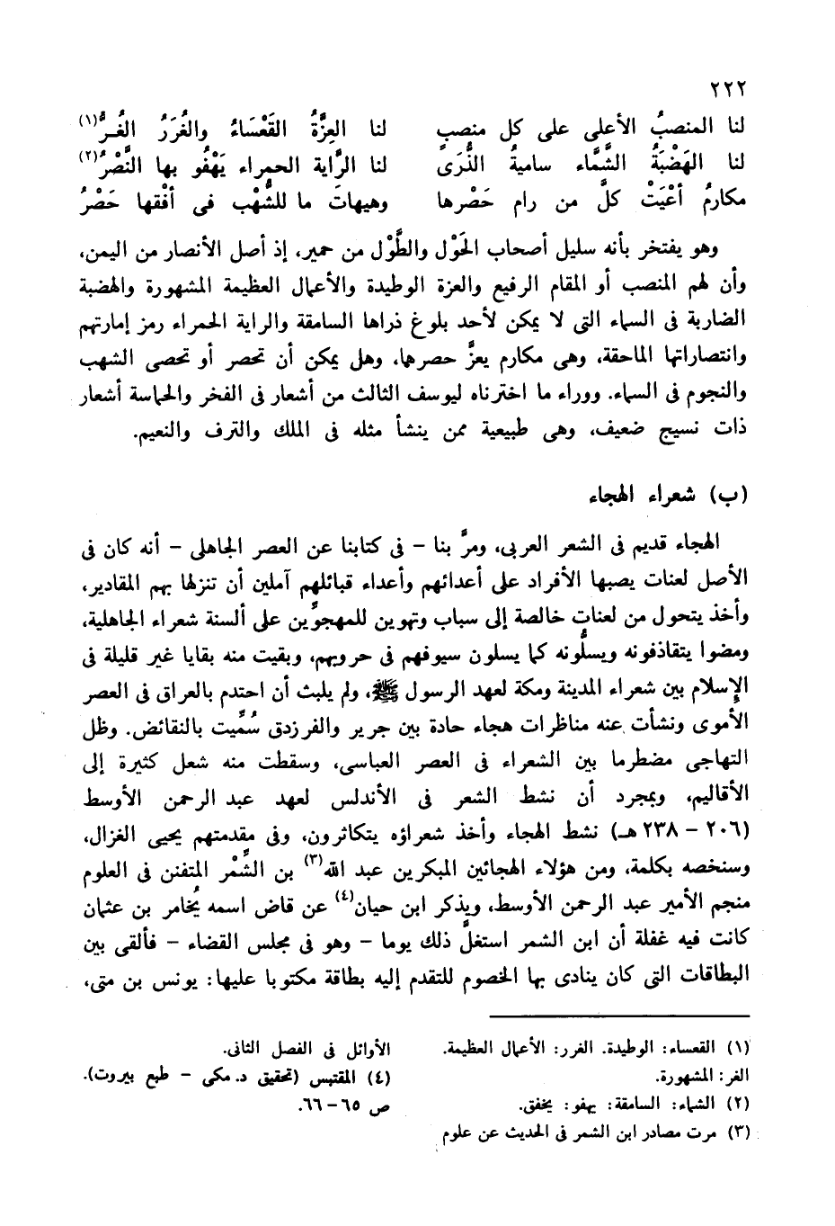 الهجاء قديم فى الشعر العربى، ومرّ بنا-فى كتابنا عن العصر الجاهلى-أنه كان فى الأصل لعنات يصبها الأفراد على أعدائهم وأعداء قبائلهم آملين أن تنزلها بهم المقادير، وأخذ يتحول من لعنات خالصة إلى سباب وتهوين للمهجوّين على ألسنة شعراء الجاهلية، ومضوا يتقاذفونه ويسلّونه كما يسلون سيوفهم فى حروبهم، وبقيت منه بقايا غير قليلة فى الإسلام بين شعراء المدينة ومكة لعهد الرسول صلّى الله عليه وسلّم، ولم يلبث أن احتدم بالعراق فى العصر الأموى ونشأت عنه مناظرات هجاء حادة بين جرير والفرزدق سمّيت بالنقائض. وظل التهاجى مضطرما بين الشعراء فى العصر العباسى، وسقطت منه شعل كثيرة إلى الأقاليم، وبمجرد أن نشط الشعر فى الأندلس لعهد عبد الرحمن الأوسط (206 - 238 هـ) نشط الهجاء وأخذ شعراؤه يتكاثرون، وفى مقدمتهم يحيى الغزال، وسنخصه بكلمة، ومن هؤلاء الهجائين المبكرين عبد الله (¬3) بن الشّمر المتفنن فى العلوم منجم الأمير عبد الرحمن الأوسط، ويذكر ابن حيان (¬4) عن قاض اسمه يخامر بن عثمان كانت فيه غفلة أن ابن الشمر استغلّ ذلك يوما-وهو فى مجلس القضاء-فألقى بين البطاقات التى كان ينادى بها الخصوم للتقدم إليه بطاقة مكتوبا عليها: يونس بن متى،