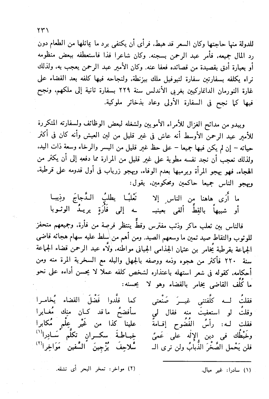 للدولة منها حاجتها وكان السعر قد هبط، فرأى أن يكتفى برد ما يماثلها من الطعام دون رد المال جميعه، فأمر عبد الرحمن بسجنه. وكان شاعرا فذا فاستعطفه ببعض منظومه أو بعبارة أدق بقصيدة من قصائده فعفا عنه. وكان الأمير عبد الرحمن يعجب به، ولذلك نراه يكلفه بسفارتين سفارة لتيوفيل ملك بيزنطة، ولنجاحه فيها كلفه بعد القضاء على غارة النورمان الدانماركيين بغربى الأندلس سنة 229 بسفارة ثانية إلى ملكهم، ونجح فيها كما نجح فى السفارة الأولى وعاد بذخائر ملوكية.