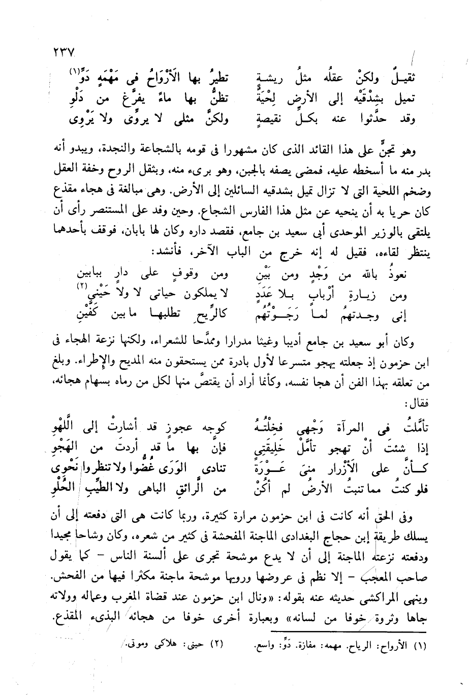 وهو تجنّ على هذا القائد الذى كان مشهورا فى قومه بالشجاعة والنجدة، ويبدو أنه بدر منه ما أسخطه عليه، فمضى يصفه بالجبن، وهو برئ منه، وبثقل الروح وخفة العقل وضخم اللحية التى لا تزال تميل بشدقيه السائلين إلى الأرض. وهى مبالغة فى هجاء مقذع كان حريا به أن ينحيه عن مثل هذا الفارس الشجاع. وحين وفد على المستنصر رأى أن يلتقى بالوزير الموحدى أبى سعيد بن جامع، فقصد داره وكان لها بابان، فوقف بأحدهما ينتظر لقاءه، فقيل له إنه خرج من الباب الآخر، فأنشد: