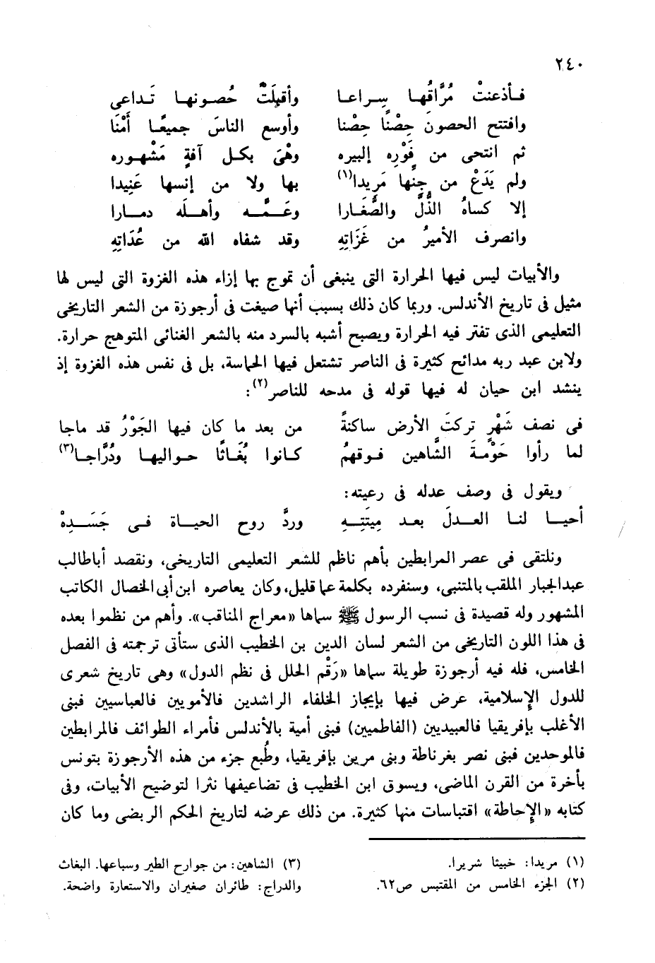 والأبيات ليس فيها الحرارة التى ينبغى أن تموج بها إزاء هذه الغزوة التى ليس لها مثيل فى تاريخ الأندلس. وربما كان ذلك بسبب أنها صيغت فى أرجوزة من الشعر التاريخى التعليمى الذى تفتر فيه الحرارة ويصبح أشبه بالسرد منه بالشعر الغنائى المتوهج حرارة.