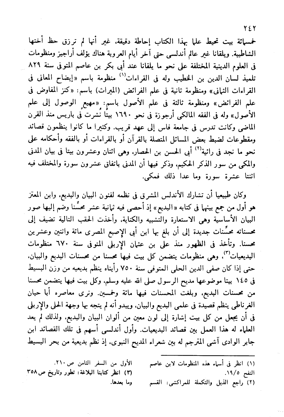 خمسمائة بيت تحيط علما بهذا الكتاب إحاطة دقيقة، غير أنها لم ترزق حظ أختها الشاطبية. ويلقانا غير عالم أندلسى حتى آخر أيام العروبة هناك يؤلف أراجيز ومنظومات فى العلوم الدينية المختلفة على نحو ما يلقانا عند أبى بكر بن عاصم المتوفى سنة 829 تلميذ لسان الدين بن الخطيب وله فى القراءات (¬1) منظومة باسم «إيضاح المعانى فى القراءات الثمانى» ومنظومة ثانية فى علم الفرائض (الميراث) باسم: «كنز المفاوض فى علم الفرائض» ومنظومة ثالثة فى علم الأصول باسم: «مهيع الوصول إلى علم الأصول» وله فى الفقه المالكى أرجوزة فى نحو 1690 بيتا نشرت فى باريس منذ القرن الماضى وكانت تدرس فى جامعة فاس إلى عهد قريب. وكثيرا ما كانوا ينظمون قصائد ومقطوعات لضبط بعض المسائل المتصلة بالقرآن أو بالقراءات أو بالفقه وأحكامه على نحو ما نجد فى رائية (¬2) أبى الحسن بن الحصار، وهى اثنان وعشرون بيتا فى بيان المدنى والمكى من سور الذكر الحكيم، وذكر فيها أن المدنى باتفاق عشرون سورة والمختلف فيه اثنتا عشرة سورة وما عدا ذلك فمكى.