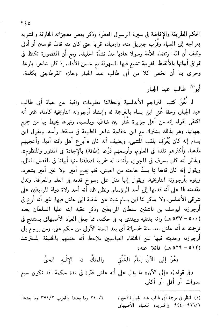 (¬1) انظر فى ترجمة أبى طالب عبد الجبار الذخيرة 1/ 916 - 944 والخريدة للعماد الأصبهانى 2/ 210 وما بعدها والمغرب 2/ 371 وما بعدها.