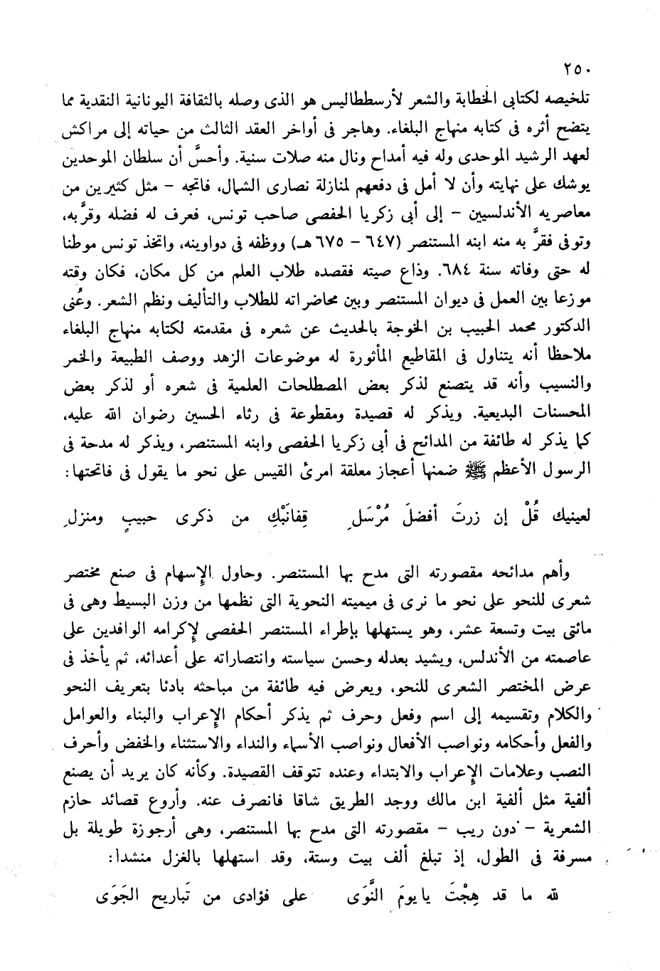 وأهم مدائحه مقصورته التى مدح بها المستنصر. وحاول الإسهام فى صنع مختصر شعرى للنحو على نحو ما نرى فى ميميته النحوية التى نظمها من وزن البسيط وهى فى مائتى بيت وتسعة عشر، وهو يستهلها بإطراء المستنصر الحفصى لإكرامه الوافدين على عاصمته من الأندلس، ويشيد بعدله وحسن سياسته وانتصاراته على أعدائه، ثم يأخذ فى عرض المختصر الشعرى للنحو، ويعرض فيه طائفة من مباحثه بادئا بتعريف النحو والكلام وتقسيمه إلى اسم وفعل وحرف ثم يذكر أحكام الإعراب والبناء والعوامل والفعل وأحكامه ونواصب الأفعال ونواصب الأسماء والنداء والاستثناء والخفض وأحرف النصب وعلامات الإعراب والابتداء وعنده تتوقف القصيدة. وكأنه كان يريد أن يصنع ألفية مثل ألفية ابن مالك ووجد الطريق شاقا فانصرف عنه. وأروع قصائد حازم الشعرية-دون ريب-مقصورته التى مدح بها المستنصر، وهى أرجوزة طويلة بل مسرفة فى الطول، إذ تبلغ ألف بيت وستة، وقد استهلها بالغزل منشدا: