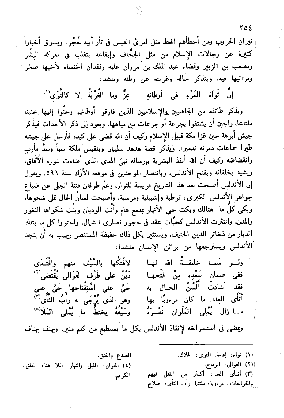 نيران الحروب ومن أخطأهم الحظ مثل امرئ القيس فى ثأر أبيه حجر. ويسوق أخبارا كثيرة عن رجالات الإسلام من مثل الجحّاف وإيقاعه بتغلب فى معركة البشر ومصعب بن الزبير وقضاء عبد الملك بن مروان عليه وفقدان الخنساء لأخيها صخر ومراثيها فيه، ويتذكر حاله وغربته عن وطنه وينشد: