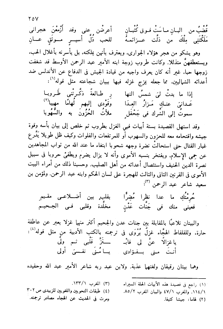 (¬1) راجع فى قصيدة هذه الأبيات الحلة السيراء 1/ 114. والمغرب 1/ 47 والبيان المغرب 2/ 85.