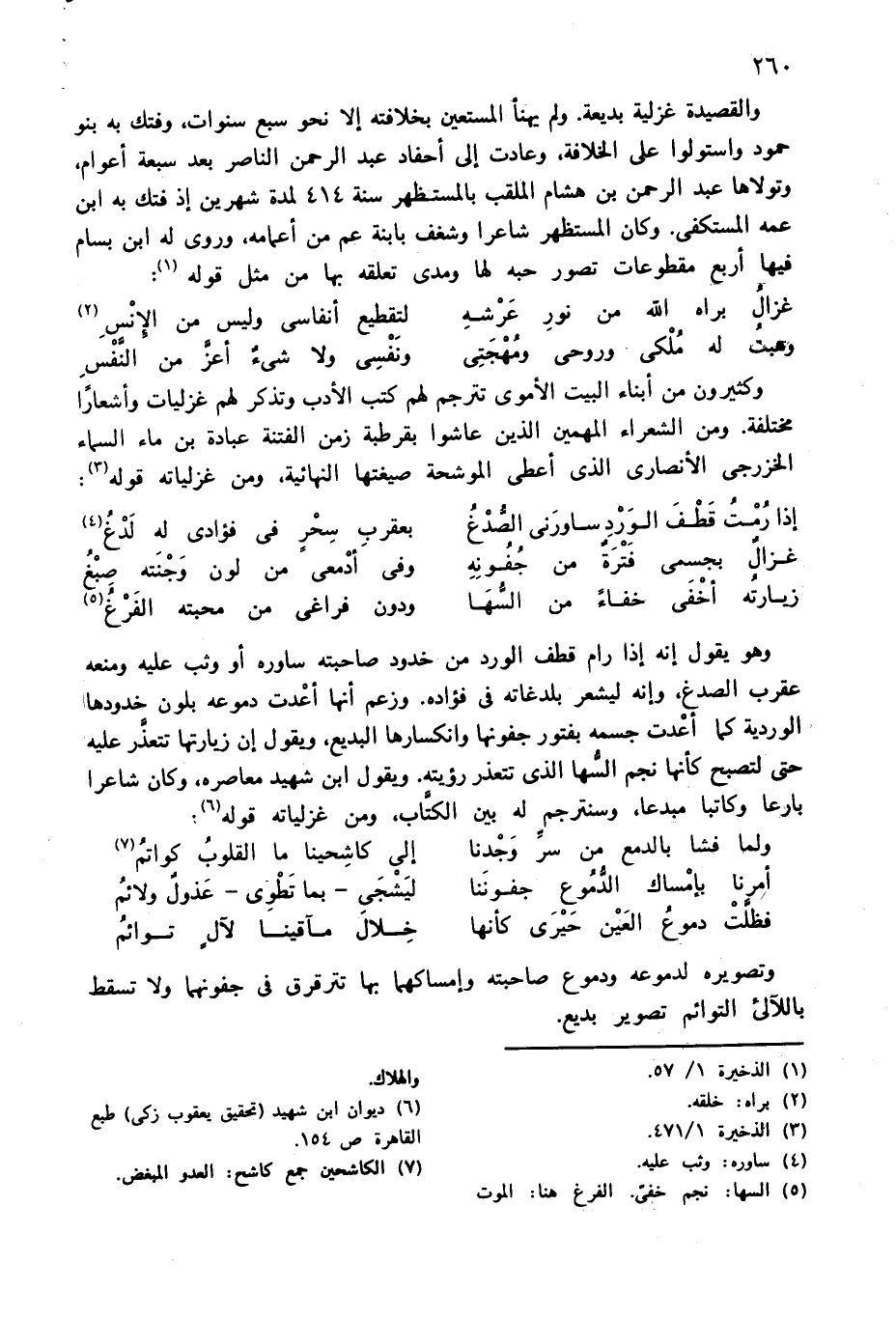 والقصيدة غزلية بديعة. ولم يهنأ المستعين بخلافته إلا نحو سبع سنوات، وفتك به بنو حمود واستولوا على الخلافة، وعادت إلى أحفاد عبد الرحمن الناصر بعد سبعة أعوام، وتولاها عبد الرحمن بن هشام الملقب بالمستظهر سنة 414 لمدة شهرين إذ فتك به ابن عمه المستكفى. وكان المستظهر شاعرا وشغف بابنة عم من أعمامه، وروى له ابن بسام فيها أربع مقطوعات تصور حبه لها ومدى تعلقه بها من مثل قوله (¬1):