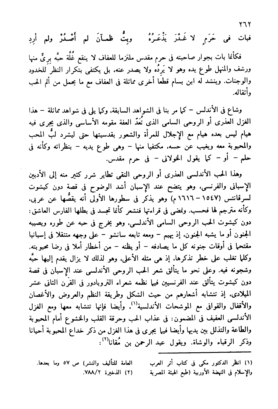 وهذا الحب الأندلسى العذرى أو الروحى النقى تطاير شرر كثير منه إلى الأدبين الإسبانى والفرنسى، وهو يتضح عند الإسبان أشد الوضوح فى قصة دون كيشوت لسرقانتس (1547 - 1616 م) وهو يذكر فى سطورها الأولى أنه يقصّها عن عربى، وكأنه مترجم لها فحسب. ونمضى فى قراءتها فنشعر كأنما تجسد فى بطلها الفارس العاشق:
