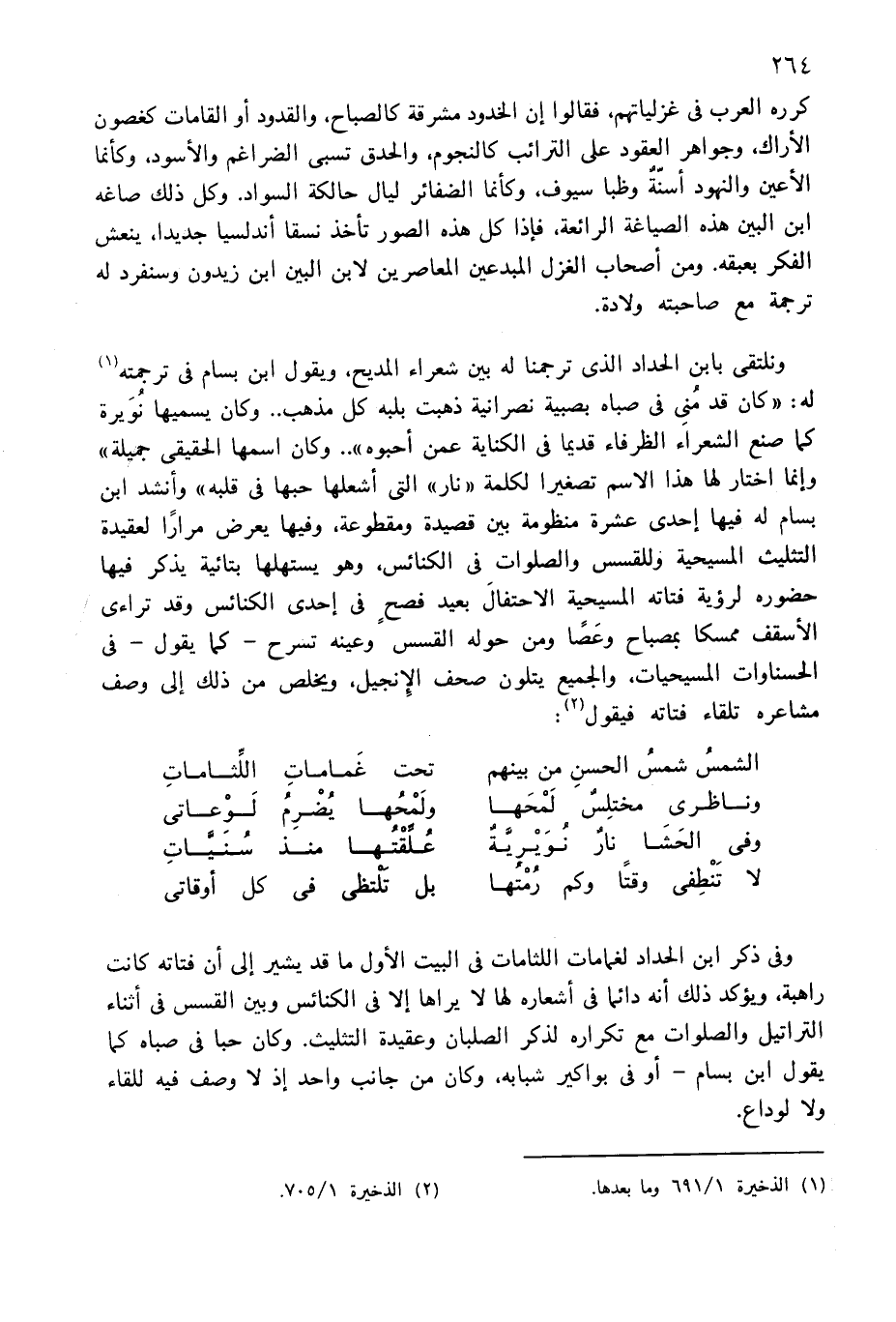 ونلتقى بابن الحداد الذى ترجمنا له بين شعراء المديح، ويقول ابن بسام فى ترجمته (¬1) له: «كان قد منى فى صباه بصبية نصرانية ذهبت بلبه كل مذهب. . وكان يسميها نويرة كما صنع الشعراء الظرفاء قديما فى الكناية عمن أحبوه». . وكان اسمها الحقيقى جميلة» وإنما اختار لها هذا الاسم تصغيرا لكلمة «نار» التى أشعلها حبها فى قلبه» وأنشد ابن بسام له فيها إحدى عشرة منظومة بين قصيدة ومقطوعة، وفيها يعرض مرارا لعقيدة التثليث المسيحية وللقسس والصلوات فى الكنائس، وهو يستهلها بتائية يذكر فيها حضوره لرؤية فتاته المسيحية الاحتفال بعيد فصح فى إحدى الكنائس وقد تراءى الأسقف ممسكا بمصباح وعصا ومن حوله القسس وعينه تسرح-كما يقول-فى الحسناوات المسيحيات، والجميع يتلون صحف الإنجيل، ويخلص من ذلك إلى وصف مشاعره تلقاء فتاته فيقول (¬2):