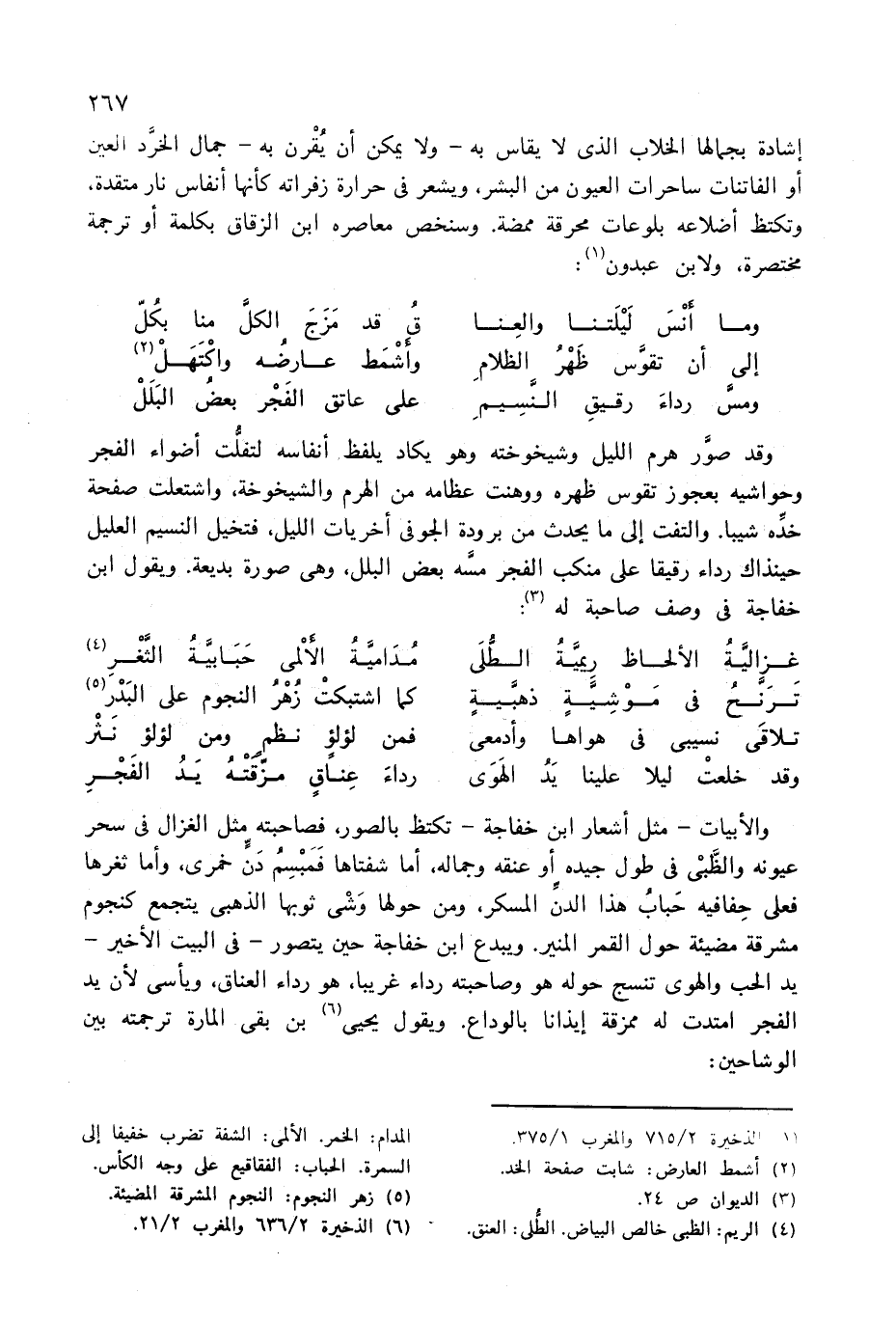 والأبيات-مثل أشعار ابن خفاجة-تكتظ بالصور، فصاحبته مثل الغزال فى سحر عيونه والظّبى فى طول جيده أو عنقه وجماله، أما شفتاها فمبسم دنّ خمرى، وأما ثغرها فعلى حفافيه حباب هذا الدنّ المسكر، ومن حولها وشى ثوبها الذهبى يتجمع كنجوم مشرقة مضيئة حول القمر المنير. ويبدع ابن خفاجة حين يتصور-فى البيت الأخير- يد الحب والهوى تنسج حوله هو وصاحبته رداء غريبا، هو رداء العناق، ويأسى لأن يد الفجر امتدت له ممزقة إيذانا بالوداع. ويقول يحيى (¬6) بن بقى المارة ترجمته بين الوشاحين: